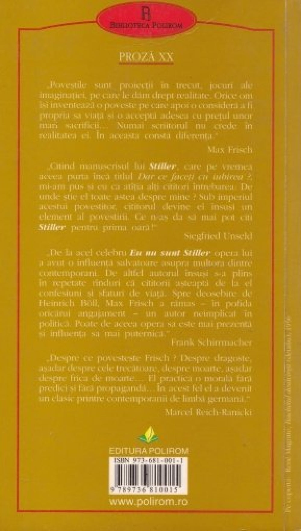 Traducere de Ondine Cristina Dascalita. Postfata de Andrei Corbea. In momentul in care ajunge in Elvetia, Mr. White este retinut de politia de frontiera, care banuieste ca acesta ar fi una si aceeasi persoana cu sculptorul Anatol Ludwig Stiller, disparut in urma cu citiva ani. Fostii prieteni ai sculptorului, doamna Julika, fosta lui sotie, si procurorul care ancheteaza cazul confirma aceasta banuiala. Insemnarile lui Mr. White din arestul politiei spun insa altceva: „Eu nu sunt Stiller”. Iar prin povestiri succesive el incearca sa se elibereze de fixarea in aceasta identitate, propunind mereu alte variante.