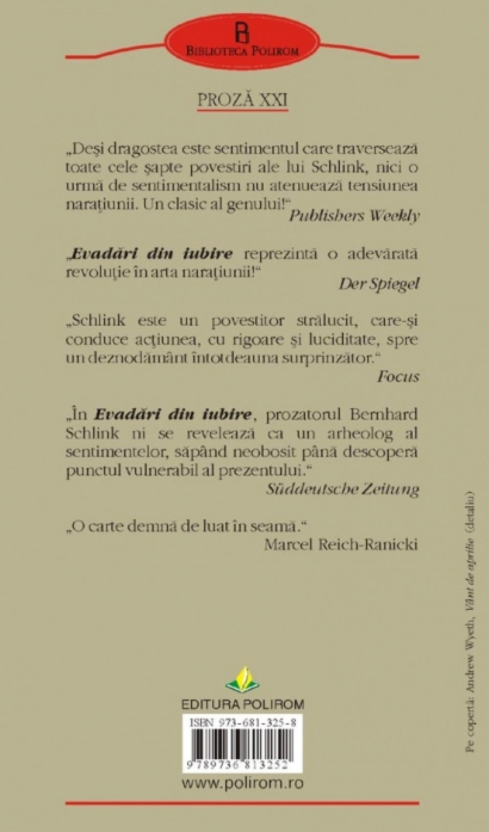 Traducere de Herta Spuhn. Sapte povestiri despre dorinte refulate si rataciri nedorite, despre pasi gresiti, dictati de disperare, si evadari spectaculoase, despre puterea ireversibila a obisnuintei, despre culpabilitate si renegare de sine. „Evadari din iubire” sint totodata si istorii ale vietii in metropola, si nuvele despre o generatie dezorientata, periclitata mereu de capcanele propriului trecut. Personajele se confrunta cu cite o taina: a altora, dar si a propriului eu, pe care adesea nu si-l cunosc prea bine. Fiecare povestire nu este numai radiografia unei variante a iubirii, dar si urmarirea etapelor – de regula dureroase – ale deslusirii de sine. Impliniri si destramari ale sentimentelor, refugiul in si evadarea din iubire nu duc decit la limpezirea partiala a tainei revelate treptat: cititorul isi poate formula optiunile, dincolo de sfirsitul (niciodata happy-end clasic) propus de autor.