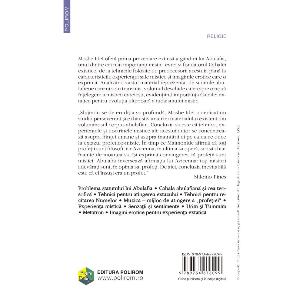Moshe Idel ofera prima prezentare ampla a gandirii lui Abulafia, unul dintre cei mai importanti mistici evrei si fondatorul Cabalei extatice, de la tehnicile folosite de predecesorii acestuia – incluzand aici si muzica – pana la caracteristicile experientei sale mistice si imaginile erotice cu ajutorul carora este ea exprimata. Analizand vastul material reprezentat de scrierile abulafiene care ni s-au transmis, volumul deschide calea spre o noua intelegere a misticii evreiesti, evidentiind importanta Cabalei extatice pentru evolutia ulterioara a iudaismului mistic.