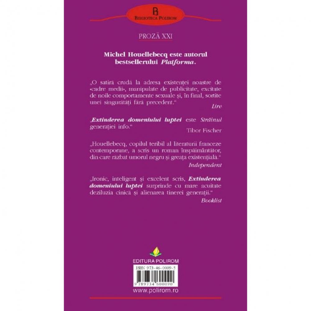 Extinderea domeniului luptei este mica odisee blazata a personajului principal, un informatician de 30 de ani care isi practica meseria fara zel sau convingere, acceptindu-si cu resemnare conditia de rotita in angrenajul unui sistem. E insa un observator atent si lucid al lumii din jur, iar analiza lui este cruda, lipsita de iluzii sau complezenta. Descriind lupta cotidiana a semenilor sai pentru un pic de iubire, de placere sau bani, el transforma in batalie epica cel mai neinsemnat gest al lor. O deplasare in provincie ii va permite sa-si extinda cimpul observatiei si sa elaboreze o teorie a liberalismului, economic ori sexual. Houellebecq diagnosticheaza un rau profund al societatii occidentale si ii dezvaluie legatura cu ideologia dominanta; mai mult, ii denunta delirul, care impune in permanenta criterii de rentabilitate, judecarea din unghiul performantei chiar si a vietii intime.
