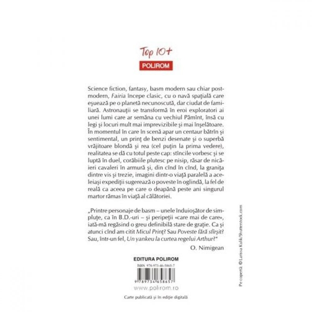 Science fiction, fantasy, basm modern sau chiar post-modern, Fairia incepe clasic, cu o nava spatiala care esueaza pe o planeta necunoscuta, dar ciudat de familiara. Astronautii se transforma in eroi exploratori ai unei lumi care ar semana cu vechiul Pamint, insa cu legi si locuri mult mai imprevizibile si mai inselatoare. In momentul in care in scena apar un centaur batrin si sentimental, un print de benzi desenate si o superba vrajitoare blonda si rea (cel putin la prima vedere), realitatea se da cu totul peste cap: stincile vorbesc si se lupta in duel, corabiile plutesc pe nisip, rasar de nicaieri cavaleri in armura si, din cind in cind, la granita dintre vis si trezie, imagini dintr-o viata paralela a aceleiasi expeditii sugereaza o poveste in oglinda, la fel de reala ca aceea pe care o deapana peste ani singurul martor ramas in viata al calatoriei.