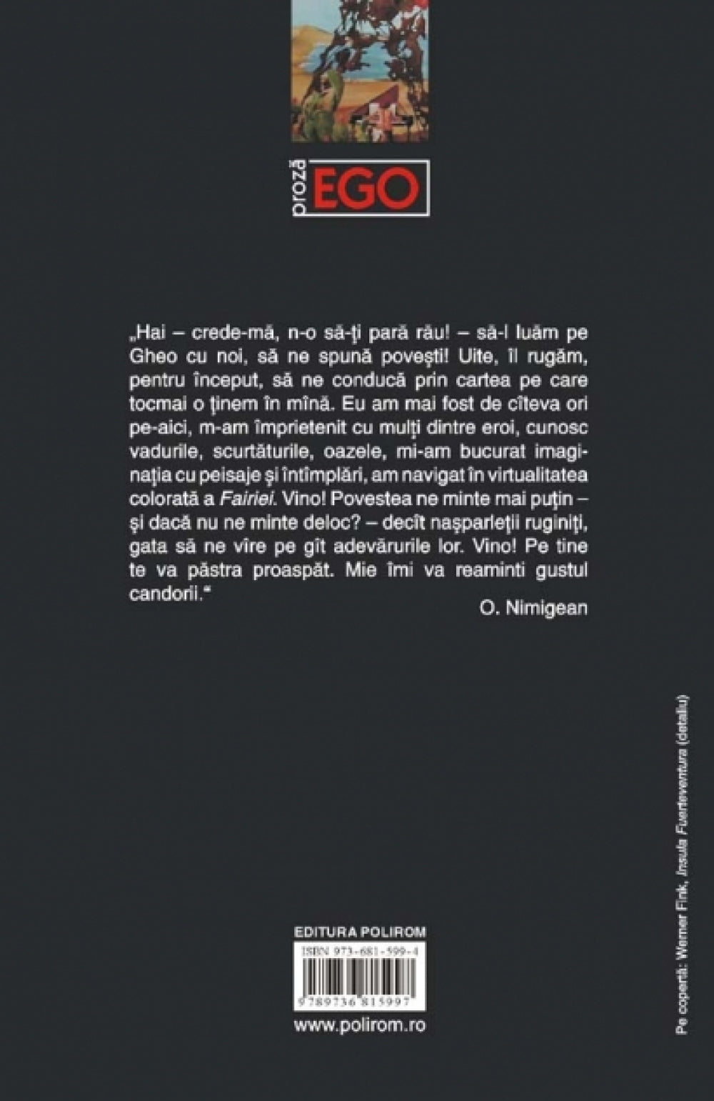 „Hai – crede-ma, n-o sa-ti para rau! – sa-l luam pe Gheo cu noi, sa ne spuna povesti! Uite, il rugam, pentru inceput, sa ne conduca prin cartea pe care tocmai o tinem in mina. Eu am mai fost de citeva ori pe-aici, m-am imprietenit cu multi dintre eroi, cunosc vadurile, scurtaturile, oazele, mi-am bucurat imaginatia cu peisaje si intimplari, am navigat in virtualitatea colorata a «Fairiei». Vino! Povestea ne minte mai putin – si daca nu ne minte deloc? – decit nasparletii ruginiti, gata sa ne vire pe git adevarurile lor. Vino! Pe tine te va pastra proaspat. Mie imi va reaminti gustul candorii.“ (O. Nimigean)