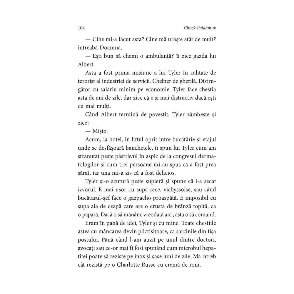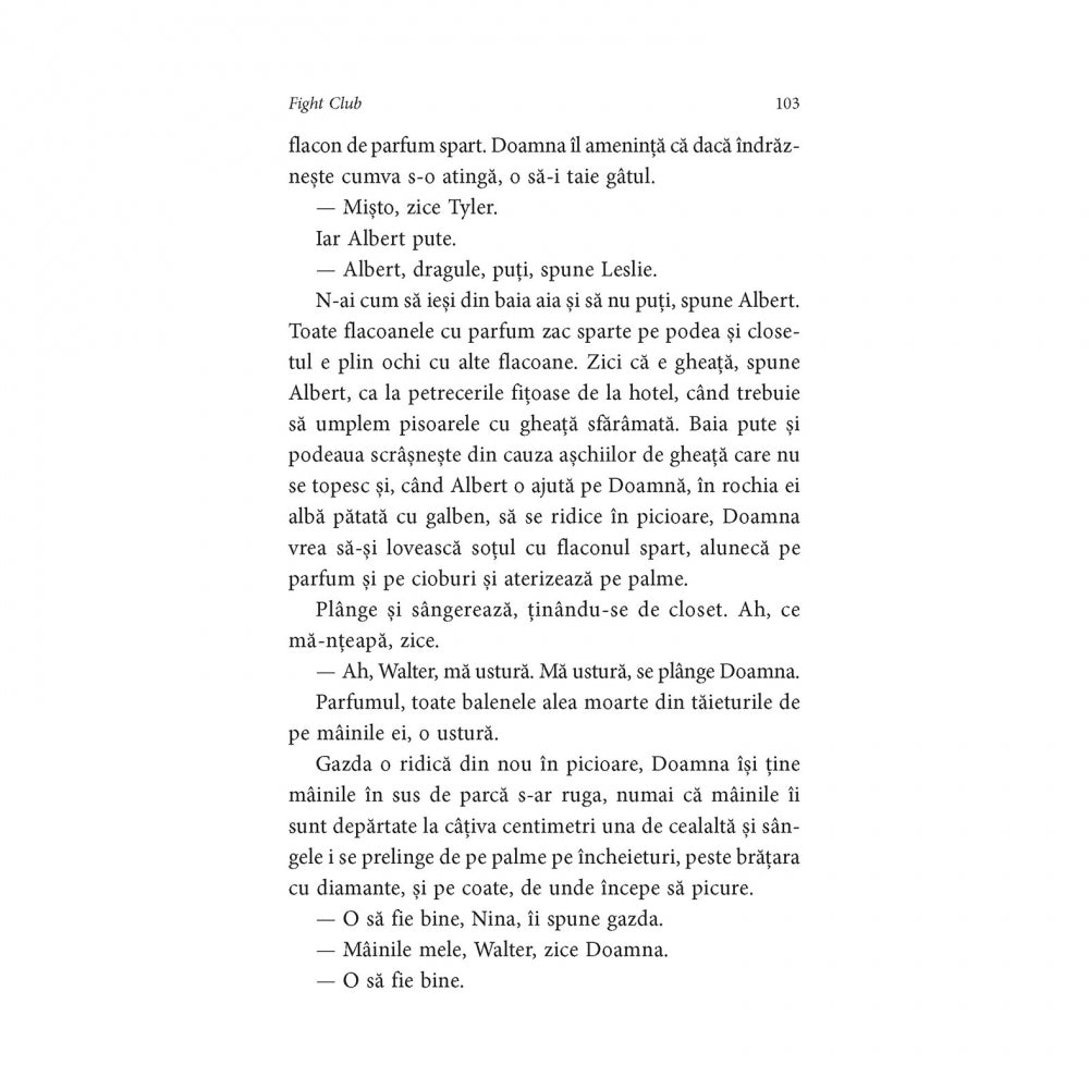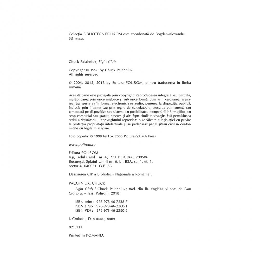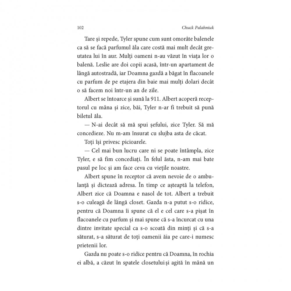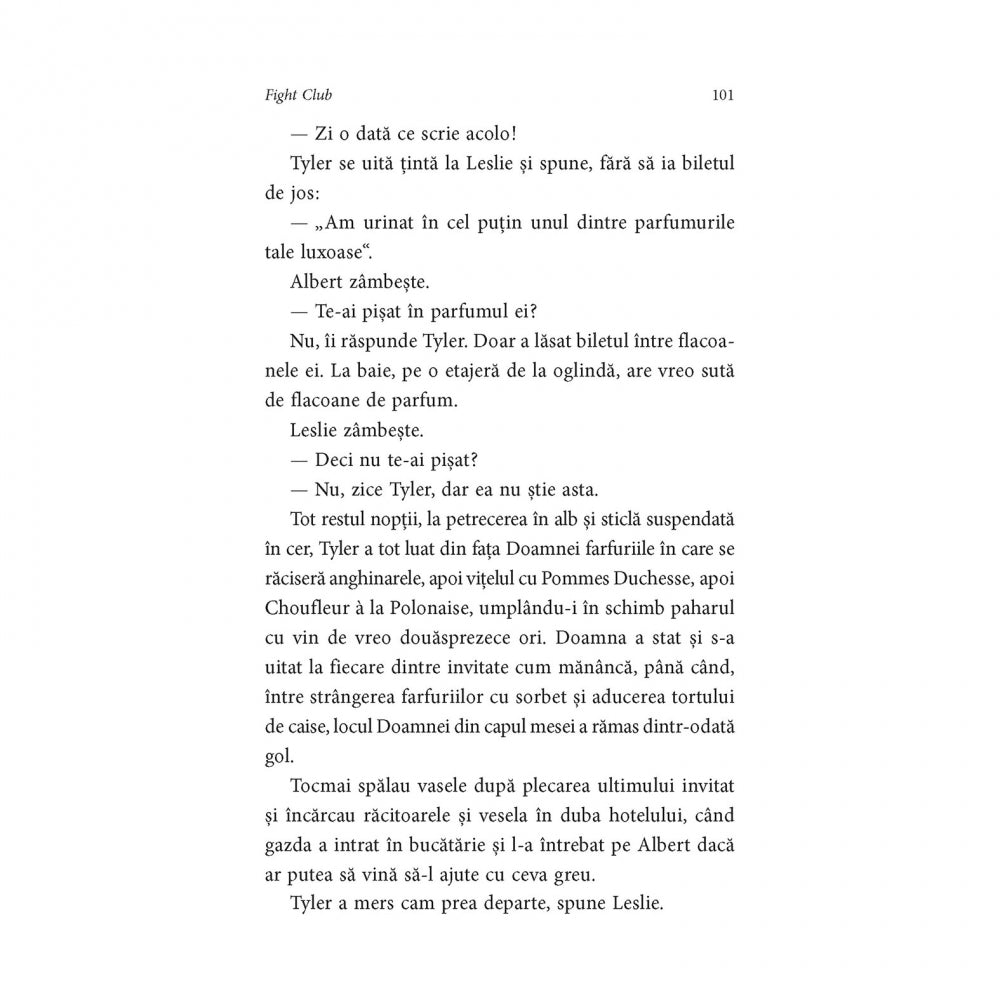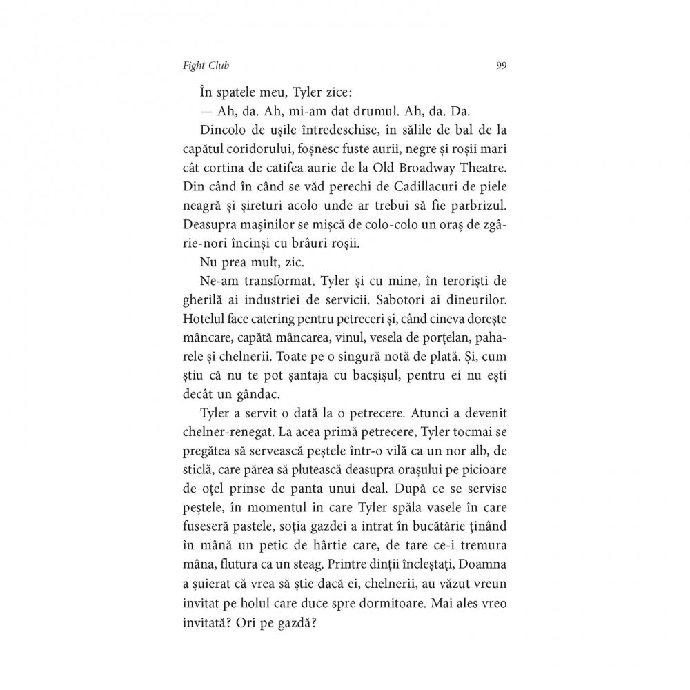 Publicat in 1996 si devenit un clasic al literaturii underground, Fight Club este unanim considerat unul dintre cele mai originale si provocatoare romane scrise in ultimul deceniu al secolului XX. Fight Club este povestea unui tinar instrainat, satul de slujba sa mediocra. El cade sub influenta unui barbat enigmatic, pe nume Tyler Durden, care organizeaza batai clandestine in subsolurile barurilor dupa ora inchiderii. Nascut din mintea lui Tyler Durden, Fight Club reprezinta un mod de evadare din viata marunta si restrictiva a lui Tyler si a tovarasilor sai. Dar in lumea lor nu exista reguli, nu exista limite, nu exista obstacole.