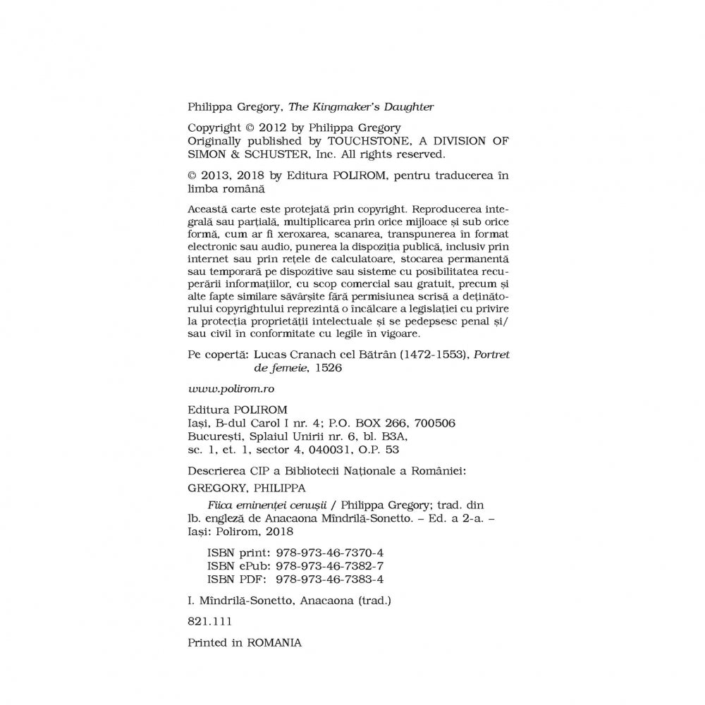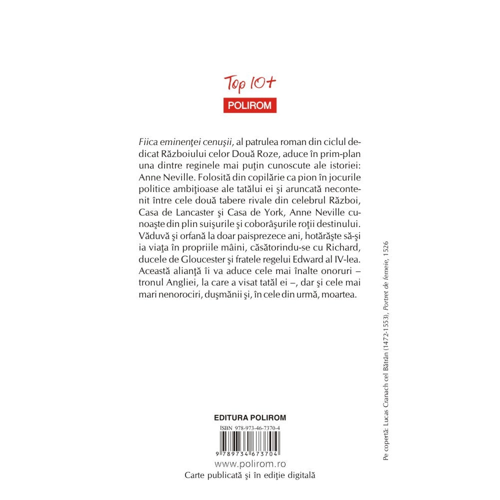 Fiica eminentei cenusii, al patrulea roman din ciclul dedicat Razboiului celor Doua Roze, aduce in prim-plan una dintre reginele mai putin cunoscute ale istoriei: Anne Neville. Folosita din copilarie ca pion in jocurile politice ambitioase ale tatalui ei si aruncata necontenit intre cele doua tabere rivale din celebrul Razboi, Casa de Lancaster si Casa de York, Anne Neville cunoaste din plin suisurile si coborisurile rotii destinului. Vaduva si orfana la doar paisprezece ani, hotaraste sa-si ia viata in propriile miini, casatorindu-se cu Richard, ducele de Gloucester si fratele regelui Edward al IV-lea. Aceasta alianta ii va aduce cele mai inalte onoruri – tronul Angliei, la care a visat tatal ei –, dar si cele mai mari nenorociri, dusmanii si, in cele din urma, moartea.