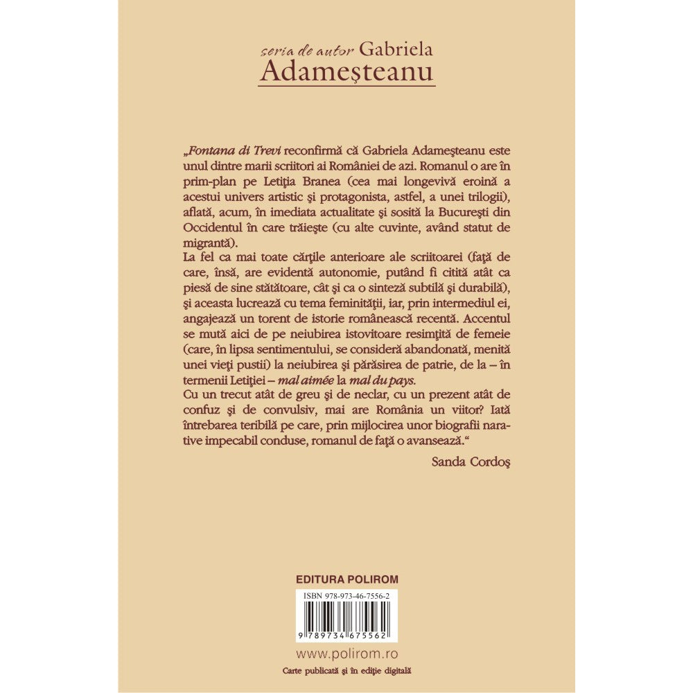 „Fontana di Trevi reconfirma ca Gabriela Adamesteanu este unul dintre marii scriitori ai Romaniei de azi. Romanul o are in prim-plan pe Letitia Branea (cea mai longeviva eroina a acestui univers artistic si protagonista, astfel, a unei trilogii), aflata, acum, in imediata actualitate si sosita la Bucuresti din Occidentul in care traieste (cu alte cuvinte, avind statut de migranta).