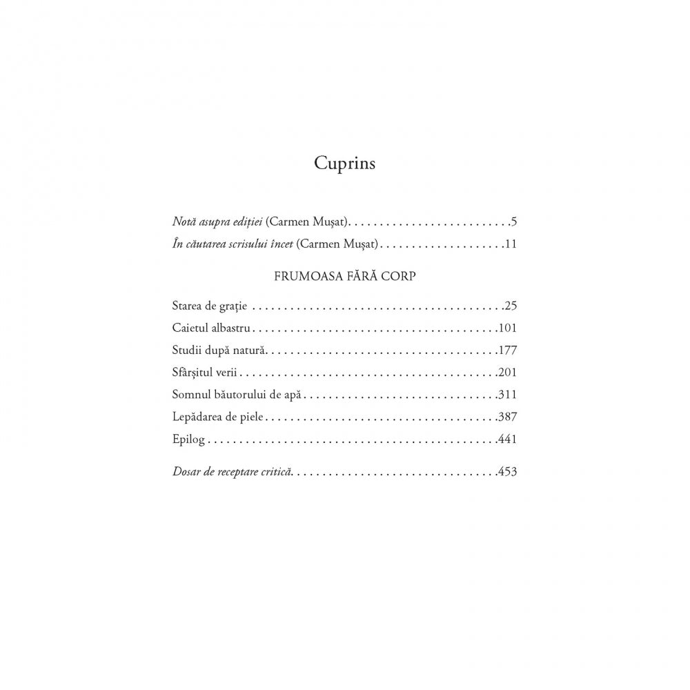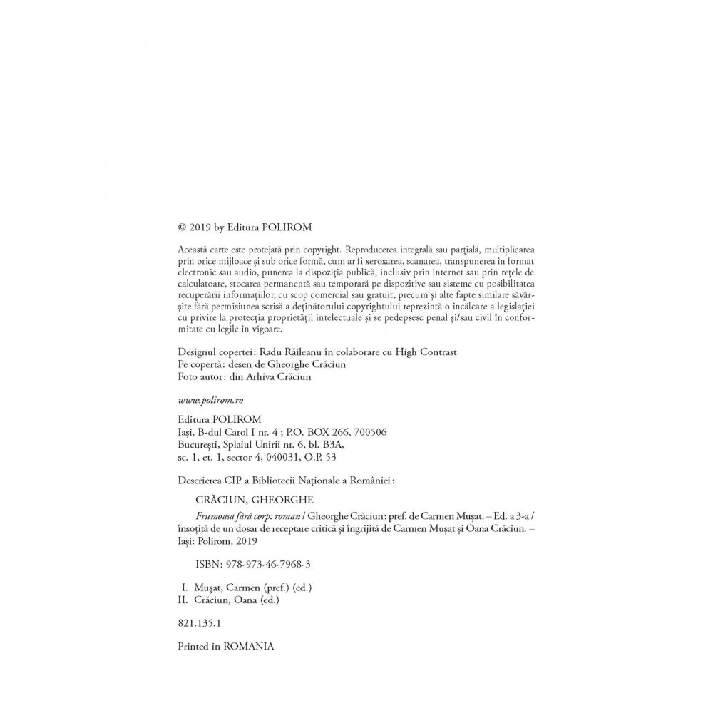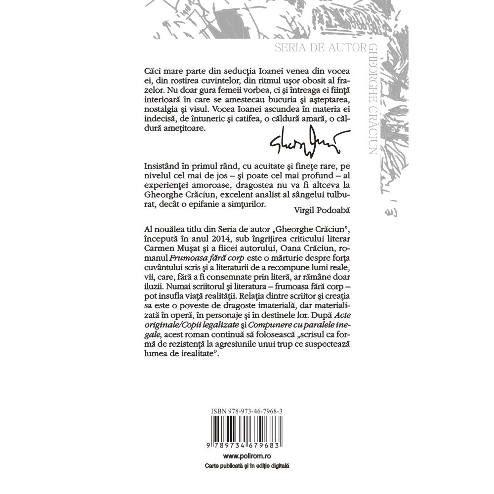 Al noualea titlu din Seria de autor „Gheorghe Craciun”, inceputa in anul 2014, sub ingrijirea criticului literar Carmen Musat si a fiicei autorului, Oana Craciun, romanul Frumoasa fara corp este o marturie despre forta cuvintului scris si a literaturii de a recompune lumi reale, vii, care, fara a fi consemnate prin litera, ar ramine doar iluzii. Numai scriitorul si literatura – frumoasa fara corp – pot insufla viata realitatii. Relatia dintre scriitor si creatia sa este o poveste de dragoste imateriala, dar materializata in opera, in personaje si in destinele lor. Dupa Acte originale/Copii legalizate si Compunere cu paralele inegale, acest roman continua sa foloseasca „scrisul ca forma de rezistenta la agresiunile unui trup ce suspecteaza lumea de irealitate”.
