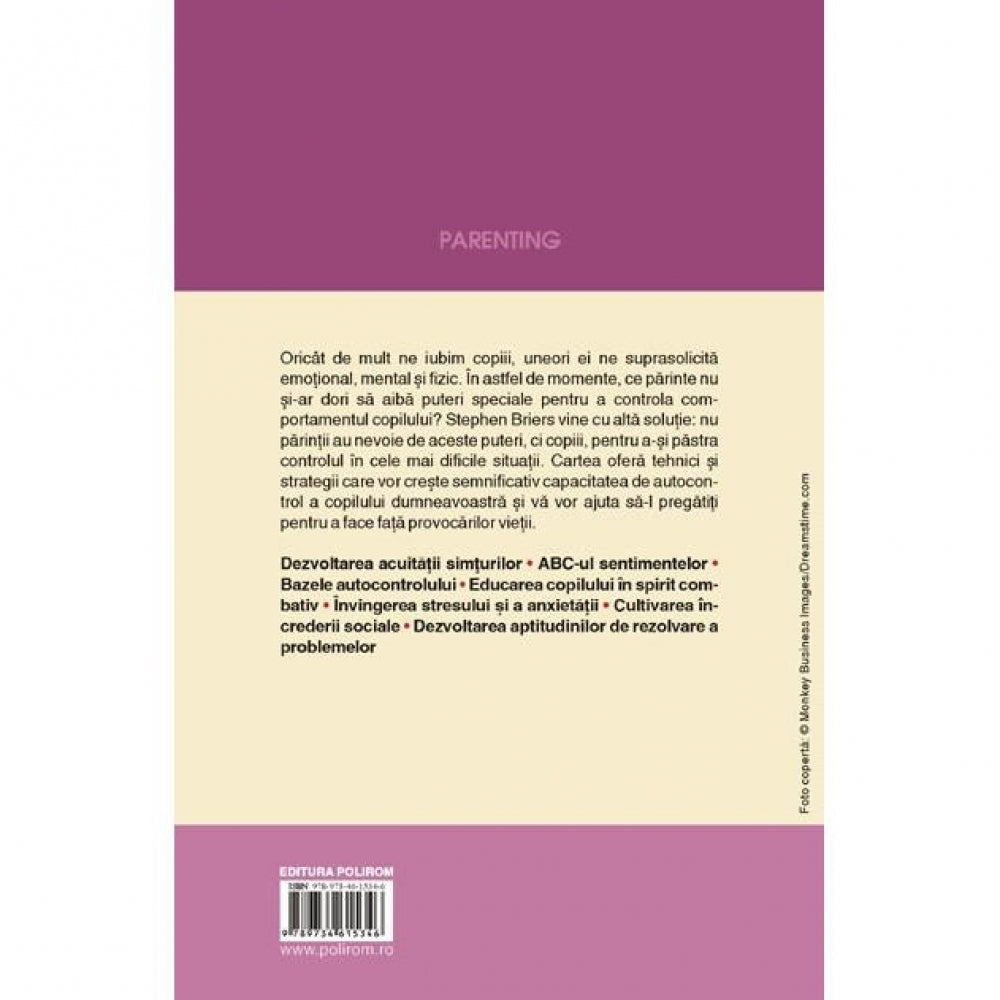 Oricit de mult ne iubim copiii, uneori ei ne suprasolicita emotional, mental si fizic. In astfel de momente, ce parinte nu si-ar dori sa aiba puteri speciale pentru a controla comportamentul copilului? Stephen Briers vine cu alta solutie: nu parintii au nevoie de aceste puteri, ci copiii, pentru a-si pastra controlul in cele mai dificile situatii. Cartea ofera tehnici si strategii care vor creste semnificativ capacitatea de autocontrol a copilului dumneavoastra si va vor ajuta sa-l pregatiti pentru a face fata provocarilor vietii.