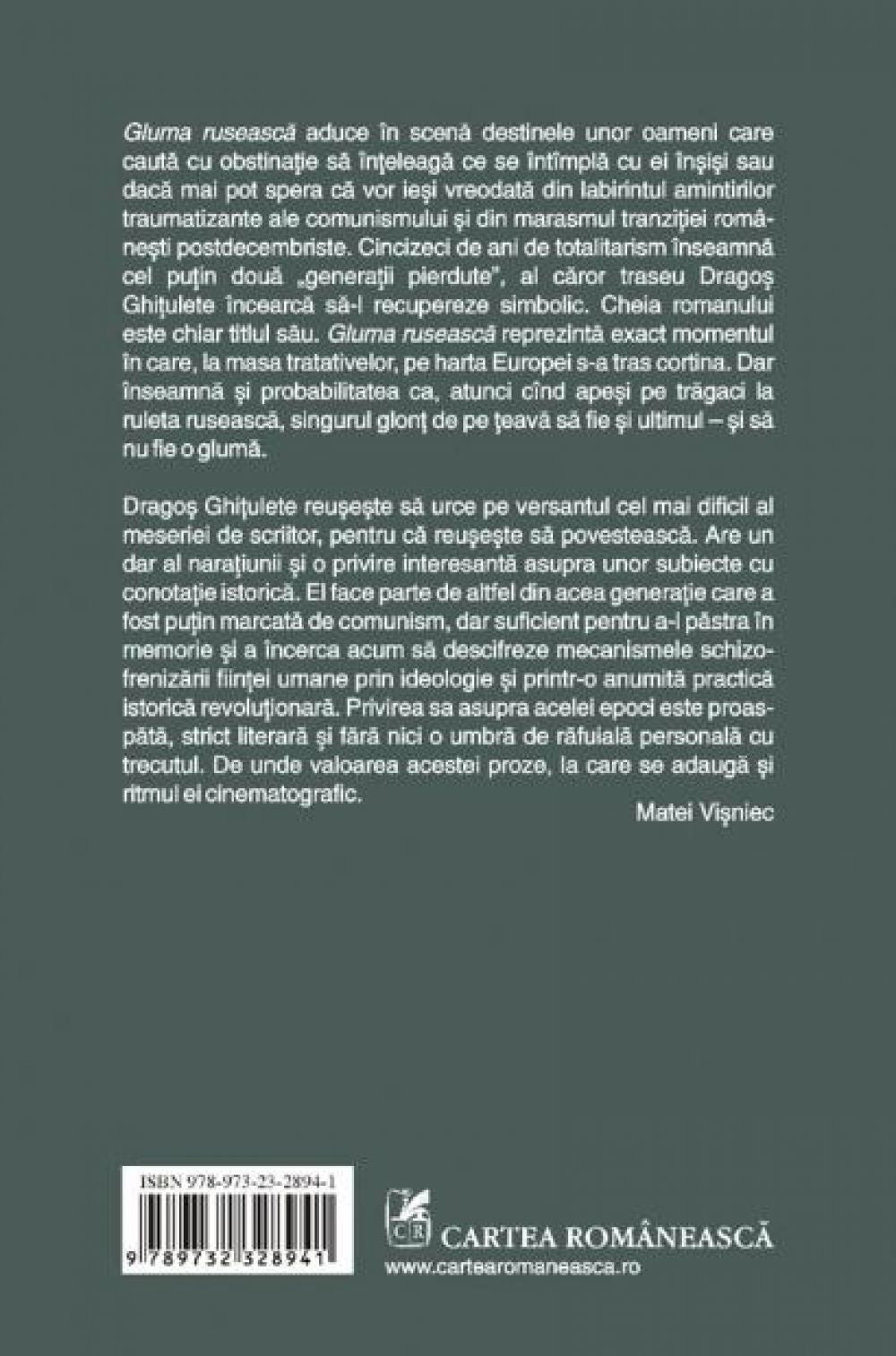 Cheia romanului este chiar titlul sau. Gluma ruseasca reprezinta exact momentul in care, la masa tratativelor, pe harta Europei s-a tras cortina. Dar inseamna si probabilitatea ca, atunci cand apesi pe tragaci la ruleta ruseasca, singurul glont de pe teava sa fie si ultimul si sa nu fie o gluma.