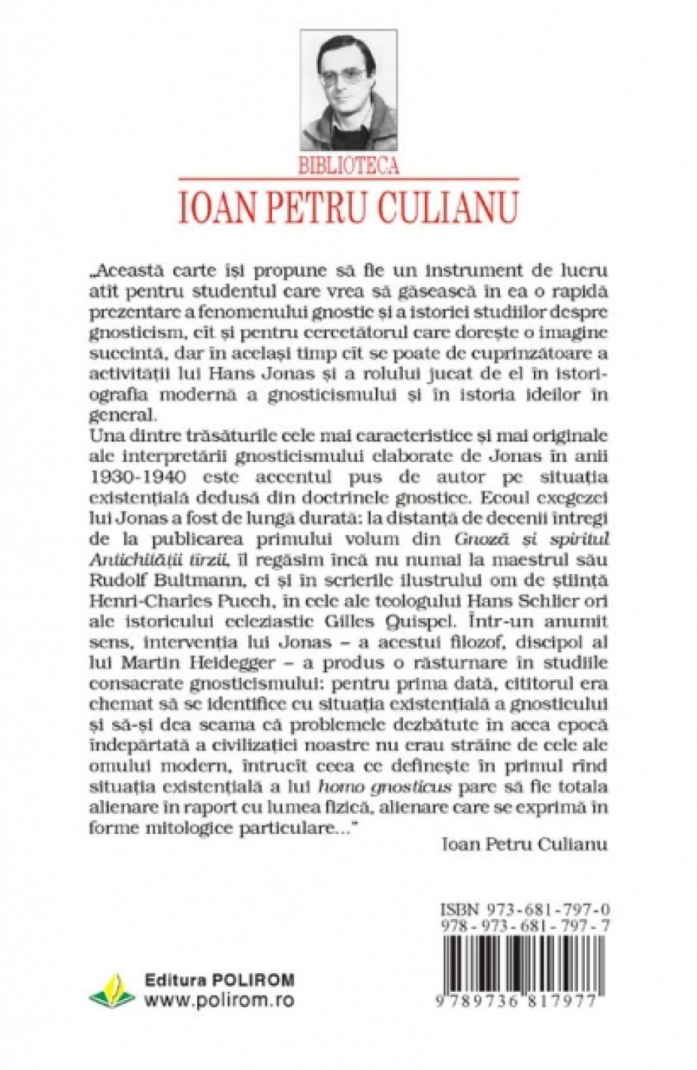 Gnosticism si gindire moderna... este considerata cea mai serioasa cercetare intreprinsa in Italia asupra lui Hans Jonas si a viziunii sale privitoare la fenomenele istorico-religioase ale Antichitatii tirzii.