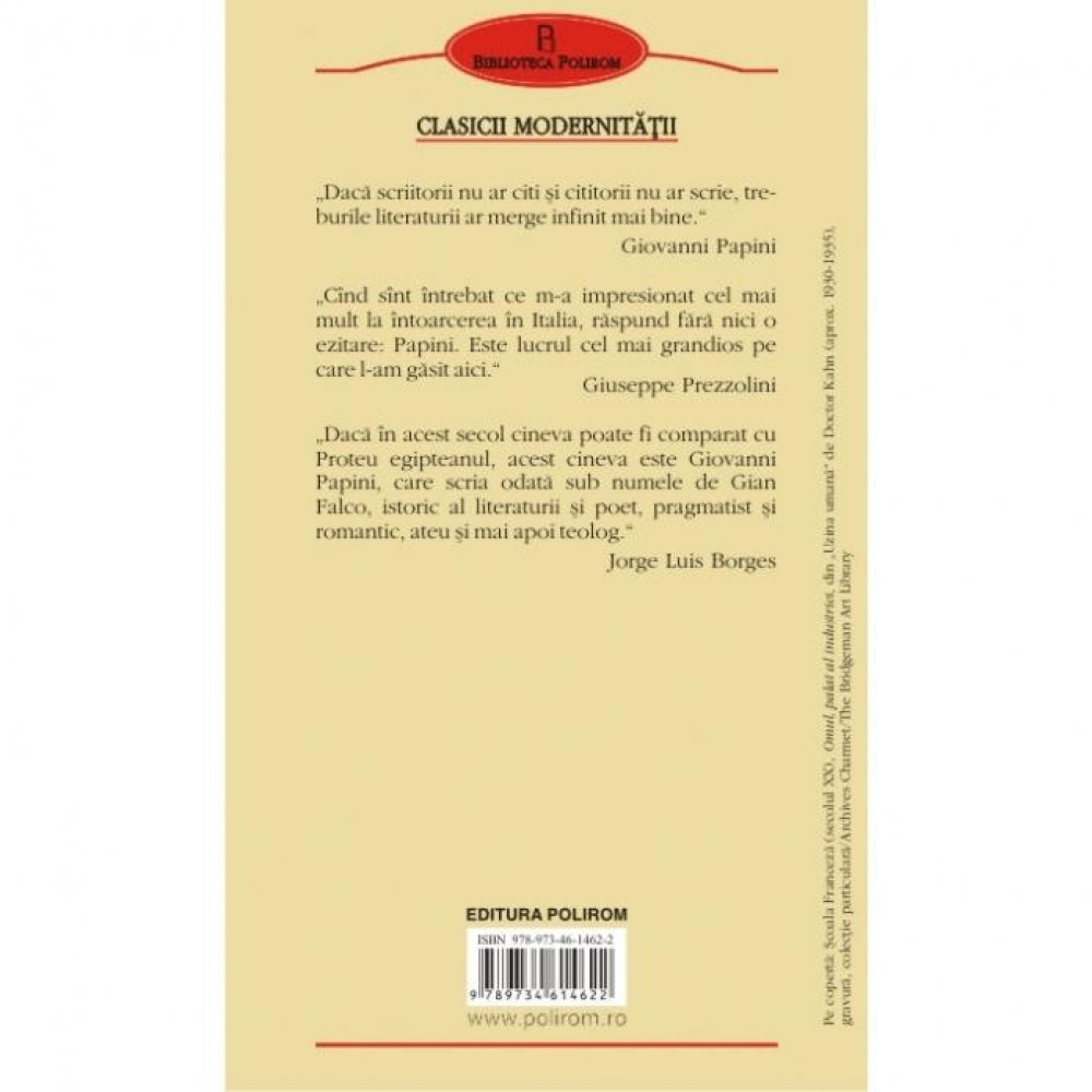„Daca in acest secol cineva poate fi comparat cu Proteu egipteanul, acest cineva este Giovanni Papini, care scria odata sub numele de Gian Falco, istoric al literaturii si poet, pragmatist si romantic, ateu si mai apoi teolog.“ (Jorge Luis Borges).