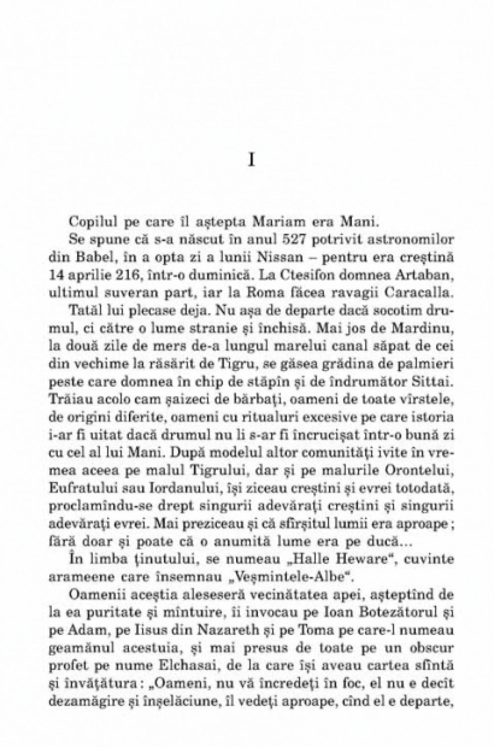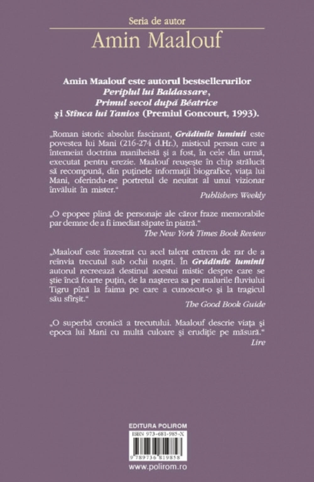 Folosim ades termenul de „maniheism”, dar oare cit stim despre acela de la care el provine? Inchinat istoriei lui Mani, romanul Gradinile luminii evoca traseul unui personaj uitat, care a fost pictor, medic si filosof in Mesopotamia Sasanizilor si care a oferit in veacul al III-lea d. Hr. o viziune asupra lumii profund umanista si indrazneata. Credinta propovaduita de Mani incearca sa le inglobeze pe toate celelalte, proclamind existenta unui Dumnezeu unic, in numele caruia Mani pledeaza pentru justitia universala, abolirea castelor si, mai presus de orice, toleranta.