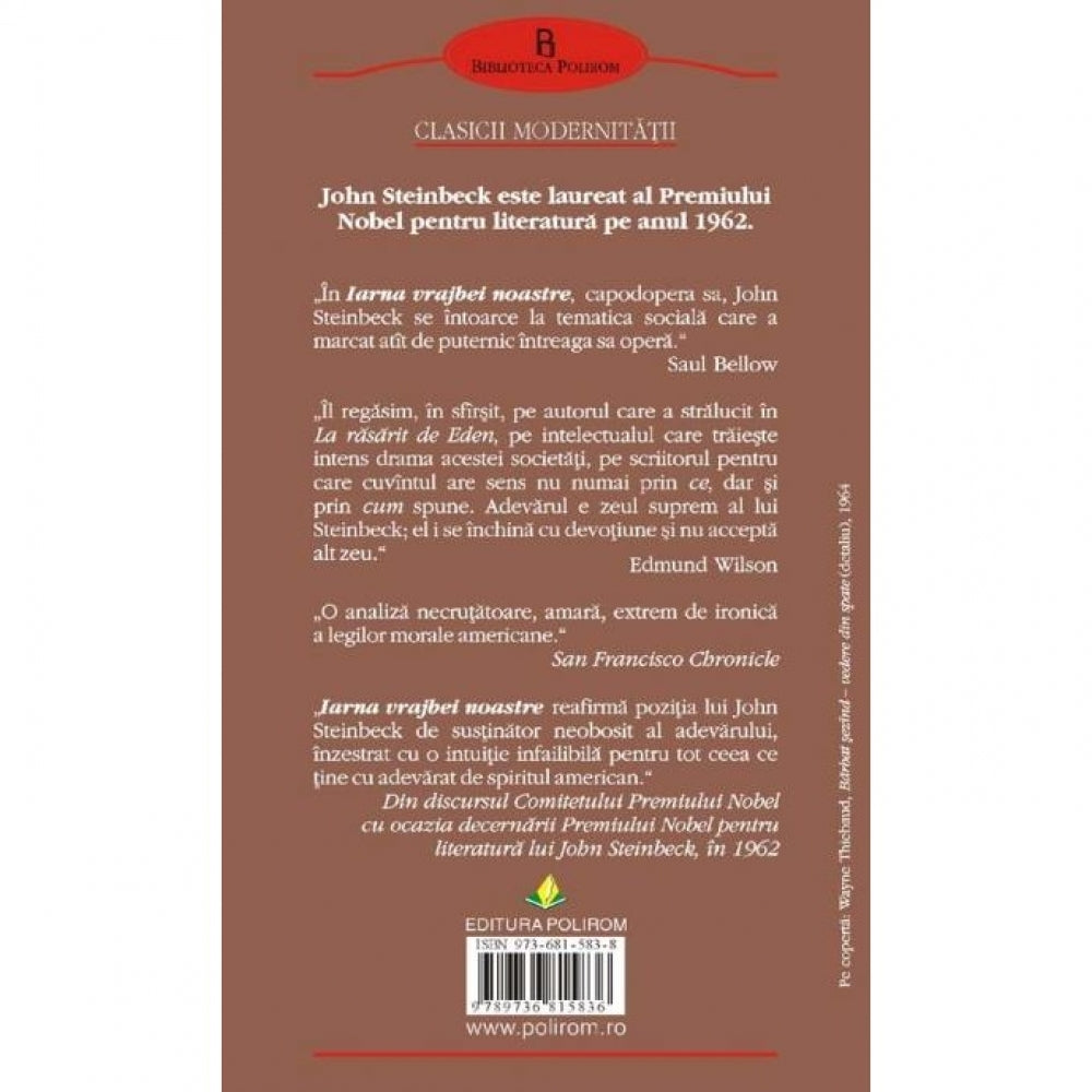 „«Iarna vrajbei noastre» reafirma pozitia lui John Steinbeck de sustinator neobosit al adevarului, inzestrat cu o intuitie infailibila pentru tot ceea ce tine cu adevarat de spiritul american.” (Din discursul Comitetului Premiului Nobel cu ocazia decernarii Premiului Nobel pentru literatura lui John Steinbeck)