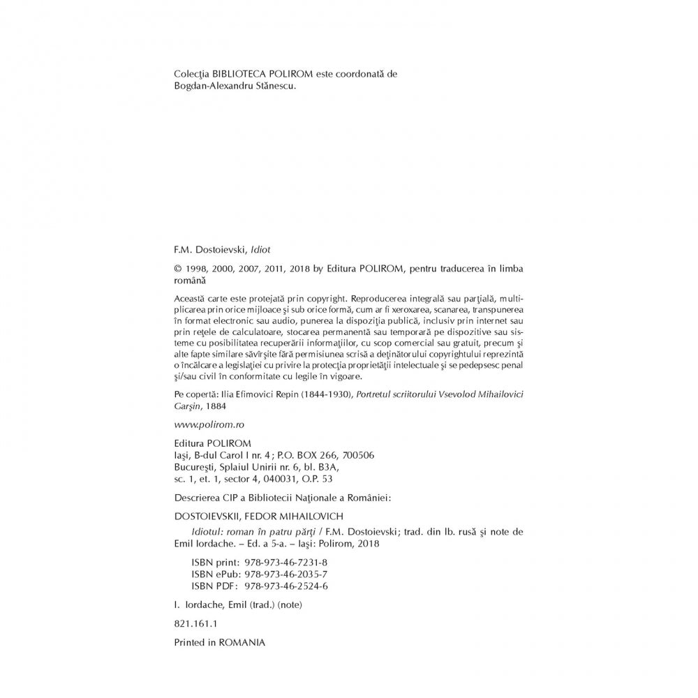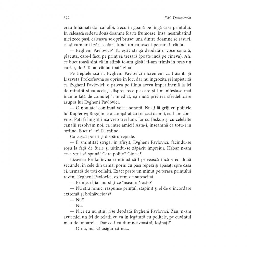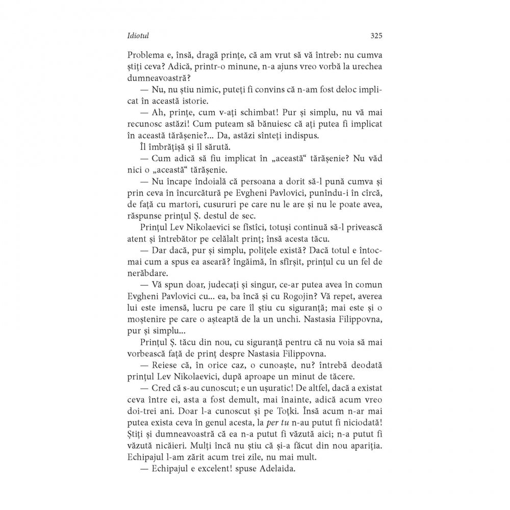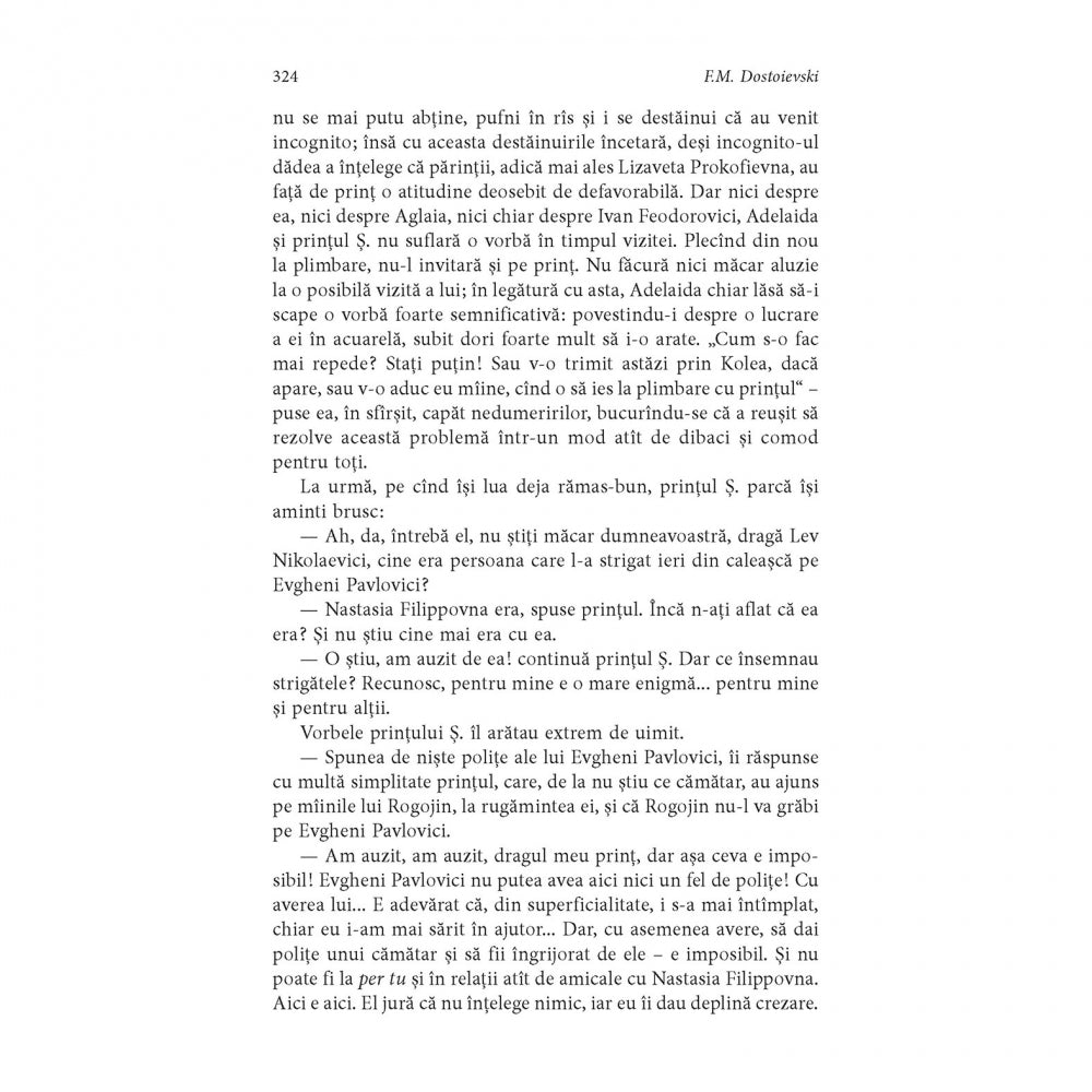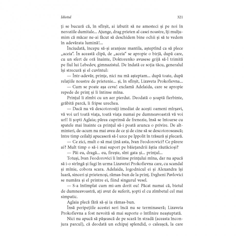 Intors la Petersburg dupa un lung tratament la sanatoriu, in Elvetia, printul Lev Nikolaevici Miskin este primit cu indoiala si luat in ris de inalta societate a orasului, care il socoteste sarac cu duhul. Miskin se poarta cu sinceritate stingace, perceputa de majoritatea oamenilor drept prostie sau perfidie. In puritatea lui, Miskin se simte atras, din motive diferite, de doua femei de situatii opuse: Aglaia Ivanovna, femeia „cinstita”, de familie buna, de care e indragostit, si Nastasia Filippovna, femeia „compromisa”, de care printul se simte legat poate chiar mai profund, prin compasiunea pe care i-o inspira. Idiotul este romanul unei perpetue surprize, al nehotaririi si al reactiei convulsive a umanului fata de faptele unei societati violente care, in lipsa ratiunii, se conduce dupa instinct si patimi.