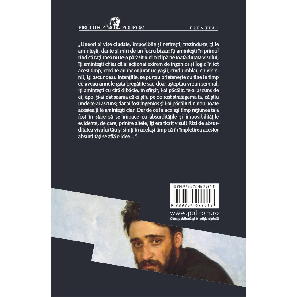 „Uneori ai vise ciudate, imposibile si nefiresti; trezindu-te, ti le amintesti, dar te si miri de un lucru bizar: iti amintesti in primul rind ca ratiunea nu te-a parasit nici o clipa pe toata durata visului, iti amintesti chiar ca ai actionat extrem de ingenios si logic in tot acest timp, cind te-au inconjurat ucigasii, cind umblau cu viclenii, isi ascundeau intentiile, se purtau prieteneste cu tine in timp ce aveau armele gata pregatite sau doar asteptau vreun semnal, iti amintesti cu cita dibacie, in sfirsit, i-ai pacalit, te-ai ascuns de ei, apoi ti-ai dat seama ca ei stiu pe de rost stratagema ta, ca stiu unde te-ai ascuns; dar ai fost ingenios si i-ai pacalit din nou, toate acestea ti le amintesti clar. Dar de ce in acelasi timp ratiunea ta a fost in stare sa se impace cu absurditatile si imposibilitatile evidente, de care, printre altele, iti era ticsit visul? Rizi de absurditatea visului tau si simti in acelasi timp ca in impletirea acestor absurditati se afla o idee…” (F.M. Dostoievski)