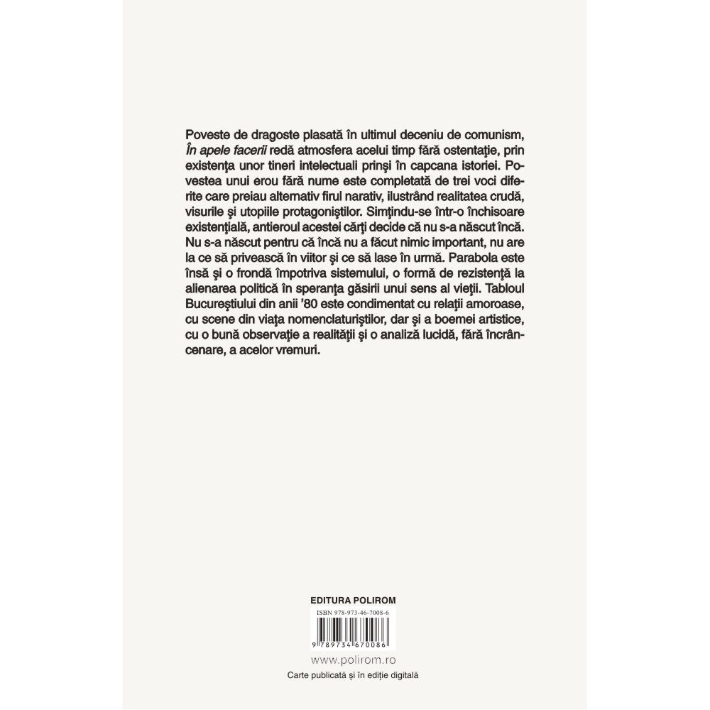 Poveste de dragoste plasata in ultimul deceniu de comunism, In apele facerii reda atmosfera acelui timp fara ostentatie, prin existenta unor tineri intelectuali prinsi in capcana istoriei. Povestea unui erou fara nume este completata de trei voci diferite care preiau alternativ firul narativ, ilustrind realitatea cruda, visurile si utopiile protagonistilor. Simtindu-se intr-o inchisoare existentiala, antieroul acestei carti decide ca nu s-a nascut inca. Nu s-a nascut pentru ca inca nu a facut nimic important, nu are la ce sa priveasca in viitor si ce sa lase in urma. Parabola este insa si o fronda impotriva sistemului, o forma de rezistenta la alienarea politica in speranta gasirii unui sens al vietii. Tabloul Bucurestiului din anii ’80 este condimentat cu relatii amoroase, cu scene din viata nomenclaturistilor, dar si a boemei artistice, cu o buna observatie a realitatii si o analiza lucida, fara incrincenare, a acelor vremuri.