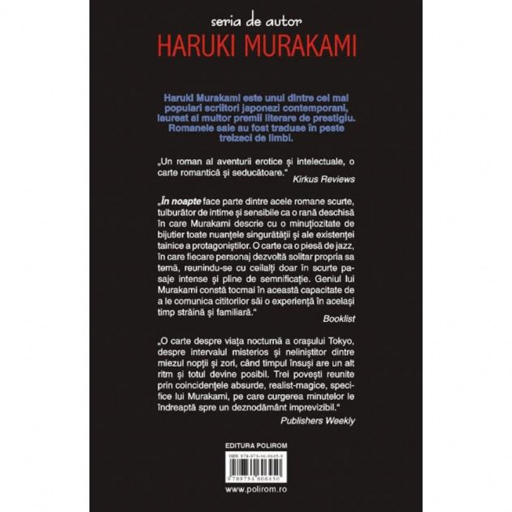 Romanul este un puzzle de personaje cum nu se poate mai diferite: Eri Asai, un fotomodel cufundat intr-un somn care dureaza de luni de zile, sora ei, Mari, o studenta pasionata de lectura, un trombonist de jazz, o tinara prostituata chinezoaica brutalizata salbatic si abandonata intr-unlove hotel, un marunt angajat la o firma de calculatoare. Toti sint oameni ai noptii bintuiti de secrete si dorinte nelamurite, iar legaturile dintre ei se lamuresc incetul cu incetul pe parcursul romanului, construind un univers nocturn plin de farmecul, subtilitatea si umorul caracteristice romanelor lui Murakami.