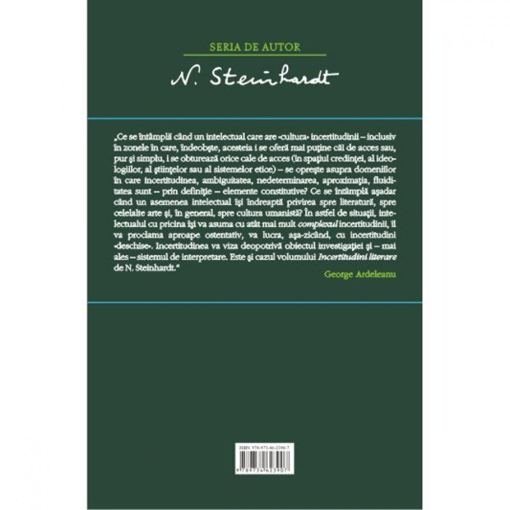 „Ce se intimpla cind un intelectual care are «cultura» incertitudinii – inclusiv in zonele in care, indeobste, acesteia i se ofera mai putine cai de acces sau, pur si simplu, i se obtureaza orice cale de acces (in spatiul credintei, al ideologiilor, al stiintelor sau al sistemelor etice) – se opreste asupra domeniilor in care incertitudinea, ambiguitatea, nedeterminarea, aproximatia, fluiditatea sint – prin definitie – elemente constitutive? Ce se intimpla asadar cind un asemenea intelectual isi indreapta privirea spre literatura, spre celelalte arte si, in general, spre cultura umanista? In astfel de situatii, intelectualul cu pricina isi va asuma cu atit mai mult complexul incertitudinii, il va proclama aproape ostentativ, va lucra, asa-zicind, cu incertitudini «deschise». Incertitudinea va viza deopotriva obiectul investigatiei si – mai ales – sistemul de interpretare. Este si cazul volumului Incertitudini literare de N. Steinhardt.” (George Ardeleanu)