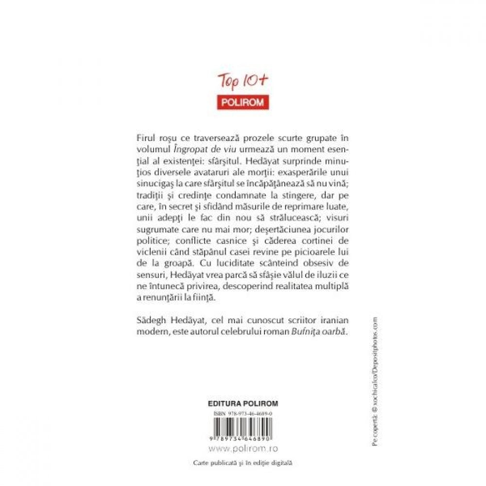 Firul rosu ce traverseaza prozele scurte grupate in volumul Ingropat de viu urmeaza un moment esential al existentei: sfirsitul. Hedayat surprinde minutios diversele avataruri ale mortii: exasperarile unui sinucigas la care sfirsitul se incapatineaza sa nu vina; traditii si credinte condamnate la stingere, dar pe care, in secret si sfidind masurile de reprimare luate, unii adepti le fac din nou sa straluceasca; visuri sugrumate care nu mai mor; desertaciunea jocurilor politice; conflicte casnice si caderea cortinei de viclenii cind stapinul casei revine pe picioarele lui de la groapa. Cu luciditate scinteind obsesiv de sensuri, Hedayat vrea parca sa sfisie valul de iluzii ce ne intuneca privirea, descoperind realitatea multipla a renuntarii la fiinta.
