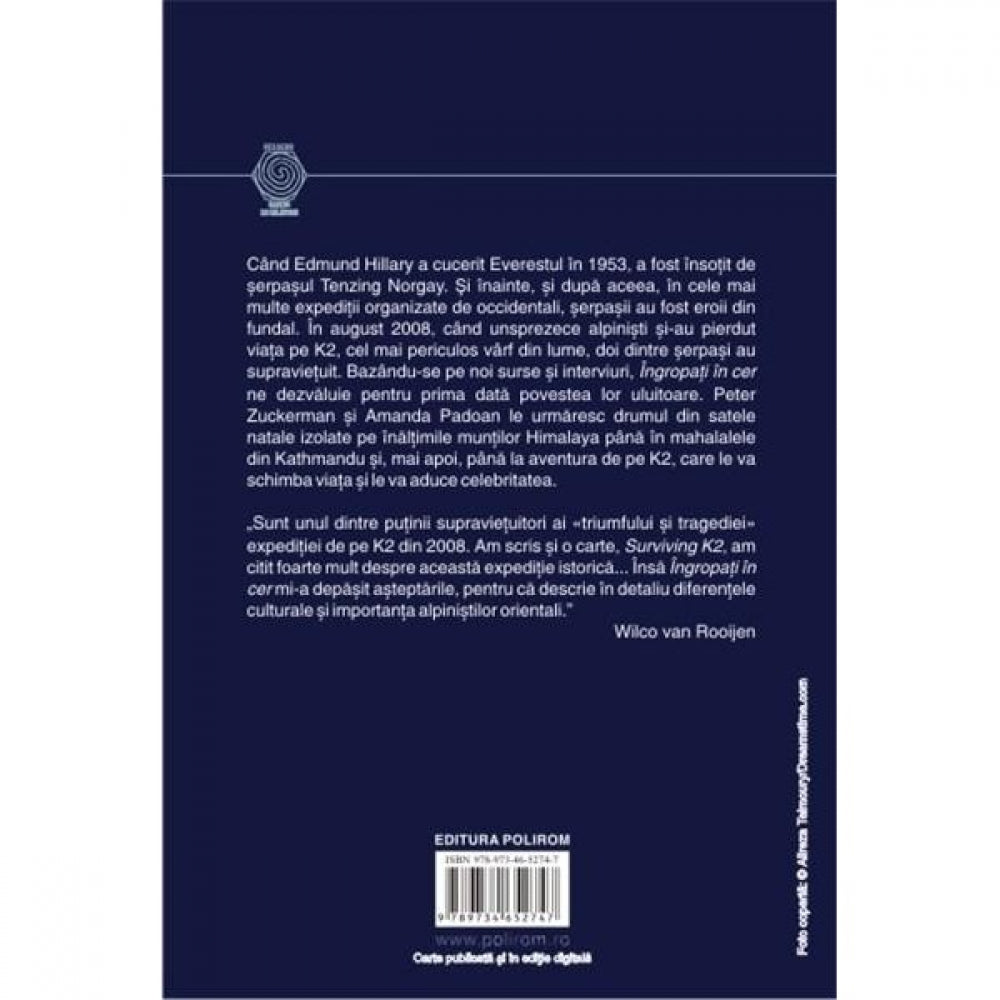 Cind Edmund Hillary a cucerit Everestul in 1953, a fost insotit de serpasul Tenzing Norgay. Si inainte, si dupa aceea, in cele mai multe expeditii organizate de occidentali, serpasii au fost eroii din fundal. In august 2008, cind unsprezece alpinisti si-au pierdut viata pe K2, cel mai periculos virf din lume, doi dintre serpasi au supravietuit. Bazindu-se pe noi surse si interviuri, Ingropati in cer ne dezvaluie pentru prima data povestea lor uluitoare. Peter Zuckerman si Amanda Padoan le urmaresc drumul din satele natale izolate pe inaltimile muntilor Himalaya pina in mahalalele din Kathmandu si, mai apoi, pina la aventura de pe K2, care le va schimba viata si le va aduce celebritatea.