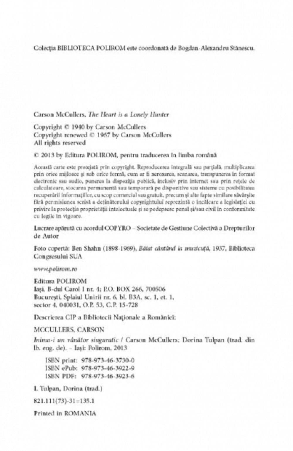 „Inima-i un vinator singuratic are o forta, o impulsivitate si o siguranta remarcabile. Arta lui Carson McCullers seamana cu un tablou de Van Gogh populat cu personaje din scrierile lui Faulkner.” (The New York Times Book Review)