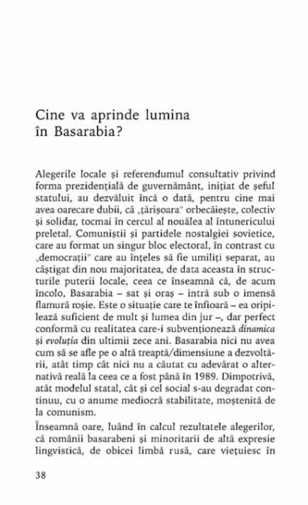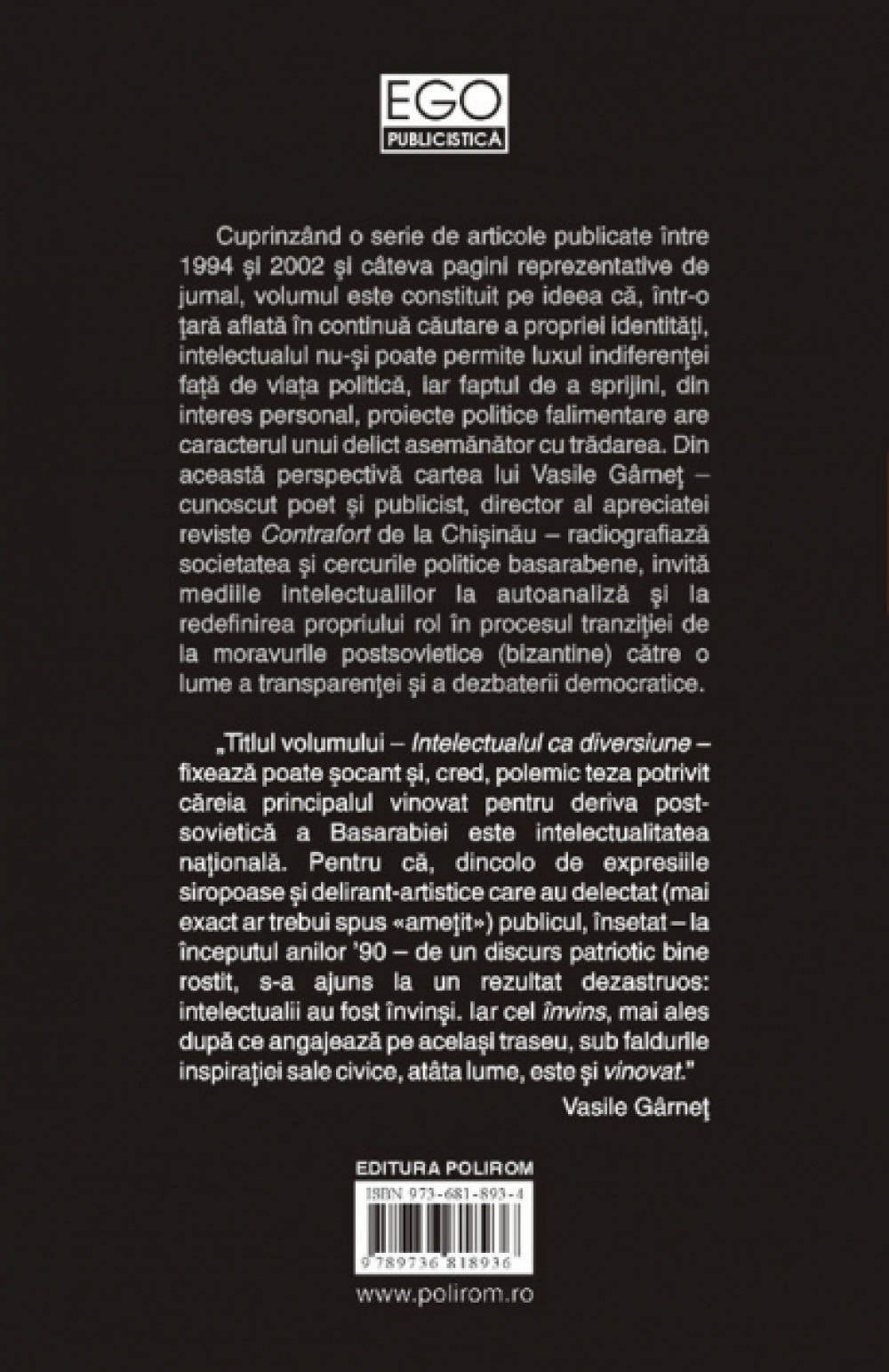 Cuprinzind o serie de articole publicate intre 1994 si 2004 si citeva pagini reprezentative de jurnal, volumul este constituit pe ideea ca, intr-o tara aflata in continua cautare a propriei identitati, intelectualul nu-si poate permite luxul indiferentei fata de viata politica, iar faptul de a sprijini, din interes personal, proiecte politice falimentare are caracterele unui delict asemanator cu tradarea. Din aceasta perspectiva, cartea lui Vasile Girnet, radiografiind societatea si cercurile politice basarabene, invita mediile intelectualilor la autoanaliza si la redefinirea propriului rol in societate.