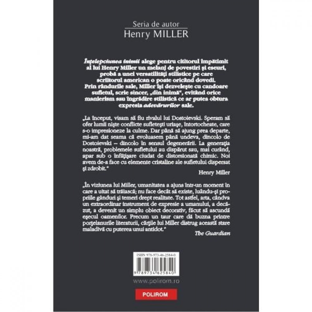 Intelepciunea inimii alege pentru cititorul impatimit al lui Henry Miller un melanj de povestiri si eseuri, proba a unei versatilitati stilistice pe care scriitorul american o poate oricind dovedi. Prin rindurile sale, Miller isi dezveleste cu candoare sufletul, scrie sincer, „din inima”, evitind orice manierism sau ingradire stilistica ce ar putea obtura expresia adevarurilor sale. Incluzind si citeva dintre cele mai cunoscute scrieri ale sale, printre care se numara „Veteranul alcoolic”, „Moartea creativitatii”, „Pintecele enorm”, „Filozoful care filozofeaza”, volumul cuprinde eseuri despre Raimu, vedeta a cinematografului la inceputurile sale, Brassaï, cunoscut fotograf al Parisului, psihanalistul E. Graham Howe si de asemenea analize ale unor opere si scriitori celebri, dintr‑o perspectiva inedita.