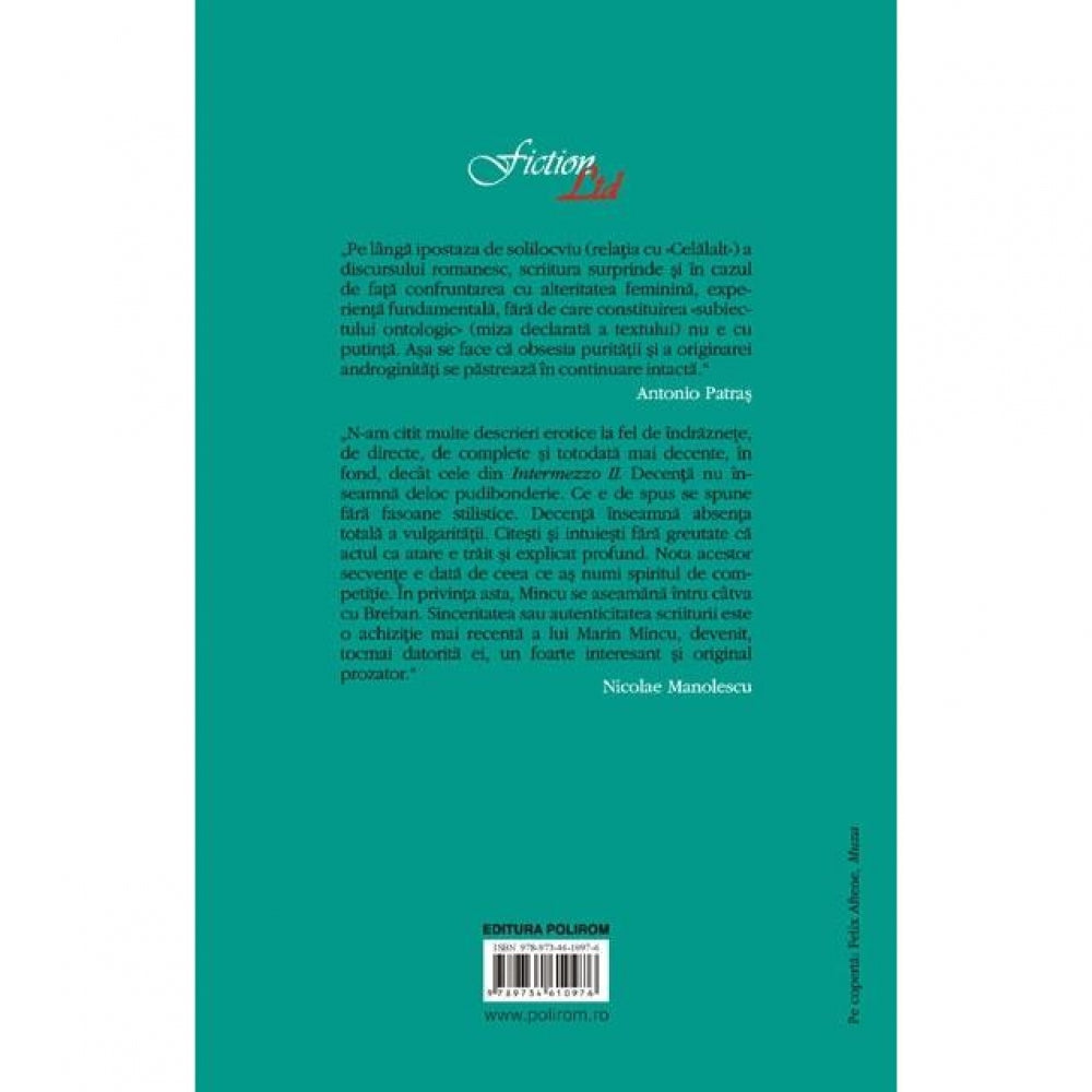 „N-am citit multe descrieri erotice la fel de indraznete, de directe, de complete si totodata mai decente, in fond, decit cele dinIntermezzo II. Decenta nu inseamna deloc pudibonderie. Ce e de spus se spune fara fasoane stilistice. Decenta inseamna absenta totala a vulgaritatii. Citesti si intuiesti fara greutate ca actul ca atare e trait si explicat profund. Nota acestor secvente e data de ceea ce as numi spiritul de competitie. In privinta asta, Mincu se aseamana intrucitva cu Breban. Sinceritatea sau autenticitatea scriiturii este o achizitie mai recenta a lui Marin Mincu, devenit, tocmai datorita ei, un foarte interesant si original prozator.”(Nicolae Manolescu)