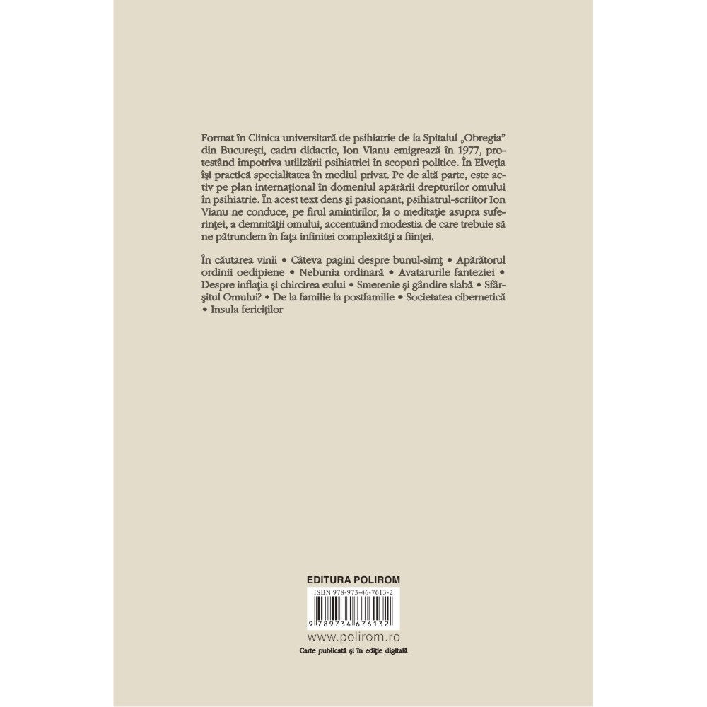 In acest text dens si pasionant, psihiatrul-scriitor Ion Vianu ne conduce, pe firul amintirilor, la o meditatie asupra suferintei, a demnitatii omului, accentuind modestia de care trebuie sa ne patrundem in fata infinitei complexitati a fiintei.
