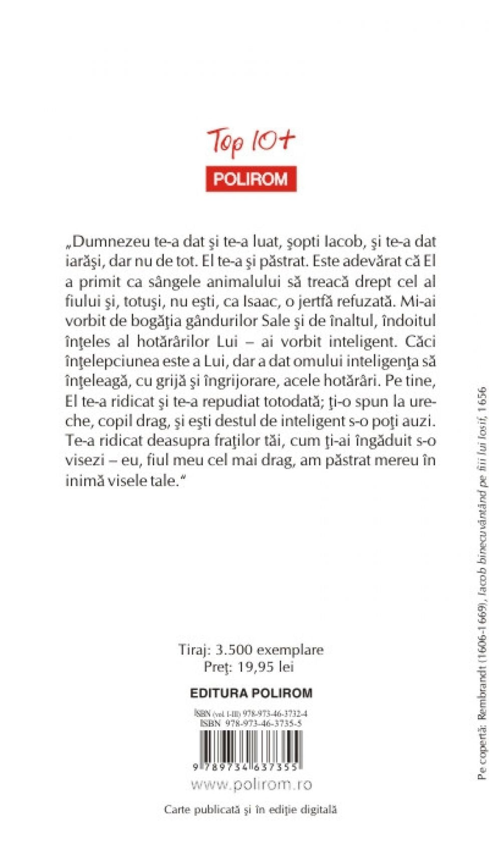 „Dumnezeu te-a dat si te-a luat, sopti Iacob, si te-a dat iarasi, dar nu de tot. El te-a si pastrat. Este adevarat ca El a primit ca singele animalului sa treaca drept cel al fiului si, totusi, nu esti, ca Isaac, o jertfa refuzata. Mi-ai vorbit de bogatia gindurilor Sale si de inaltul, indoitul inteles al hotaririlor Lui – ai vorbit inteligent. Caci intelepciunea este a Lui, dar a dat omului inteligenta sa inteleaga, cu grija si ingrijorare, acele hotariri. Pe tine, El te-a ridicat si te-a repudiat totodata; ti-o spun la ureche, copil drag, si esti destul de inteligent s-o poti auzi. Te-a ridicat deasupra fratilor tai, cum ti-ai ingaduit s-o visezi – eu, fiul meu cel mai drag, am pastrat mereu in inima visele tale.”