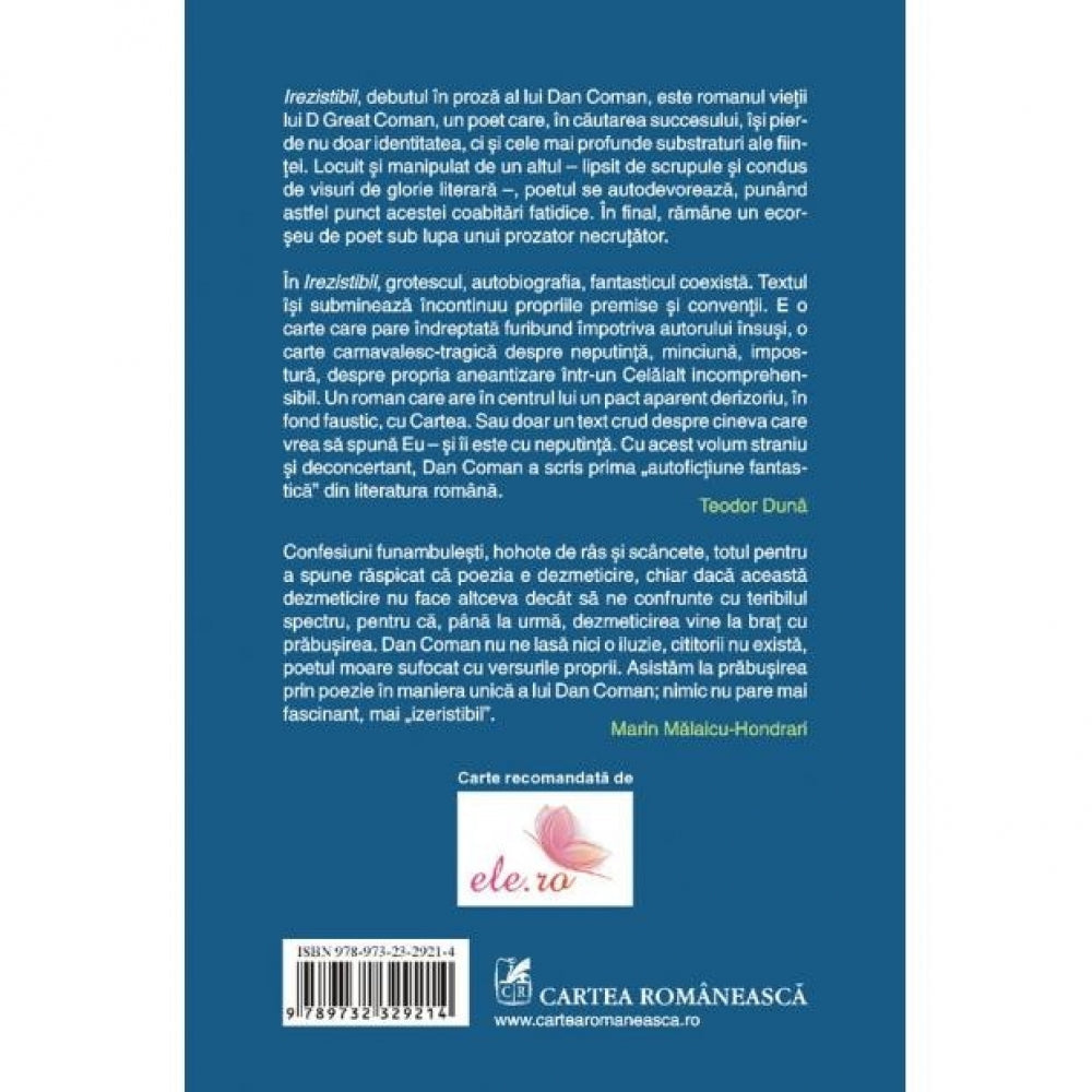 Irezistibil, debutul in proza al lui Dan Coman, este romanul vietii lui D Great Coman, un poet care, in cautarea succesului, isi pierde nu doar identitatea, ci si chiar cele mai profunde substraturi ale fiintei. Locuit si manipulat de un altul – lipsit de scrupule si condus de visuri de glorie literara – poetul se autodevoreaza, punind astfel punct acestei coabitari fatidice. In final, ramine un ecorseu de poet sub lupa unui prozator necrutator.