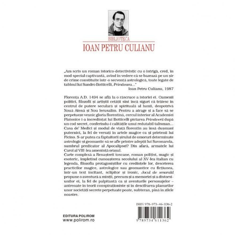 Carte complexa a Renasterii toscane, roman politist, magic si esoteric, impletind cunoasterea secolului al XV-lea italian cu legenda, filosofia protagonistilor cu credintele lor, descrierea practicilor magice, astrologice sau geomantice cu fictiunea, intr-un text incitant, sclipitor ii ironic, Jocul de smarald propune o aventura a mintii, precum si a memoriei si a distorsiunilor ei, la fel de palpitanta ca si aventurile personajelor – antrenate in teorii conspirationiste si in descifrarea planurilor unor societati secrete perpetuate poate, subteran, pina in zilele noastre.