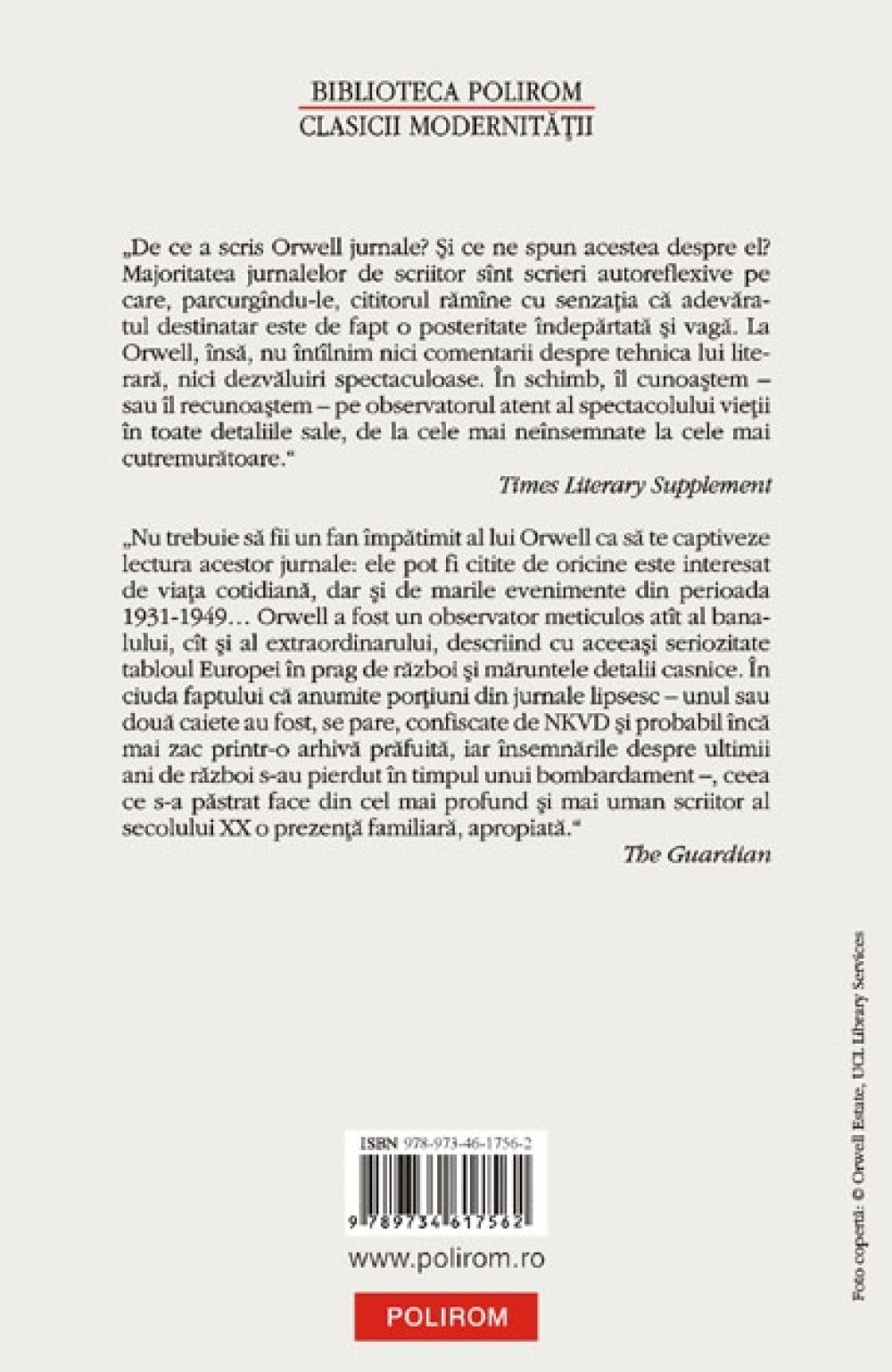 „De ce a scris Orwell jurnale? Si ce ne spun acestea despre el? Majoritatea jurnalelor de scriitor sint scrieri autoreflexive pe care, parcurgindu-le, cititorul ramine cu senzatia ca adevaratul destinatar este de fapt o posteritate indepartata si vaga. La Orwell, insa, nu intilnim nici comentarii despre tehnica lui literara, nici dezvaluiri spectaculoase. In schimb, il cunoastem —sau il recunoastem —pe observatorul atent al spectacolului vietii in toate detaliile sale, de la cele mai neinsemnate la cele mai cutremuratoare.” (Times Literary Supplement)