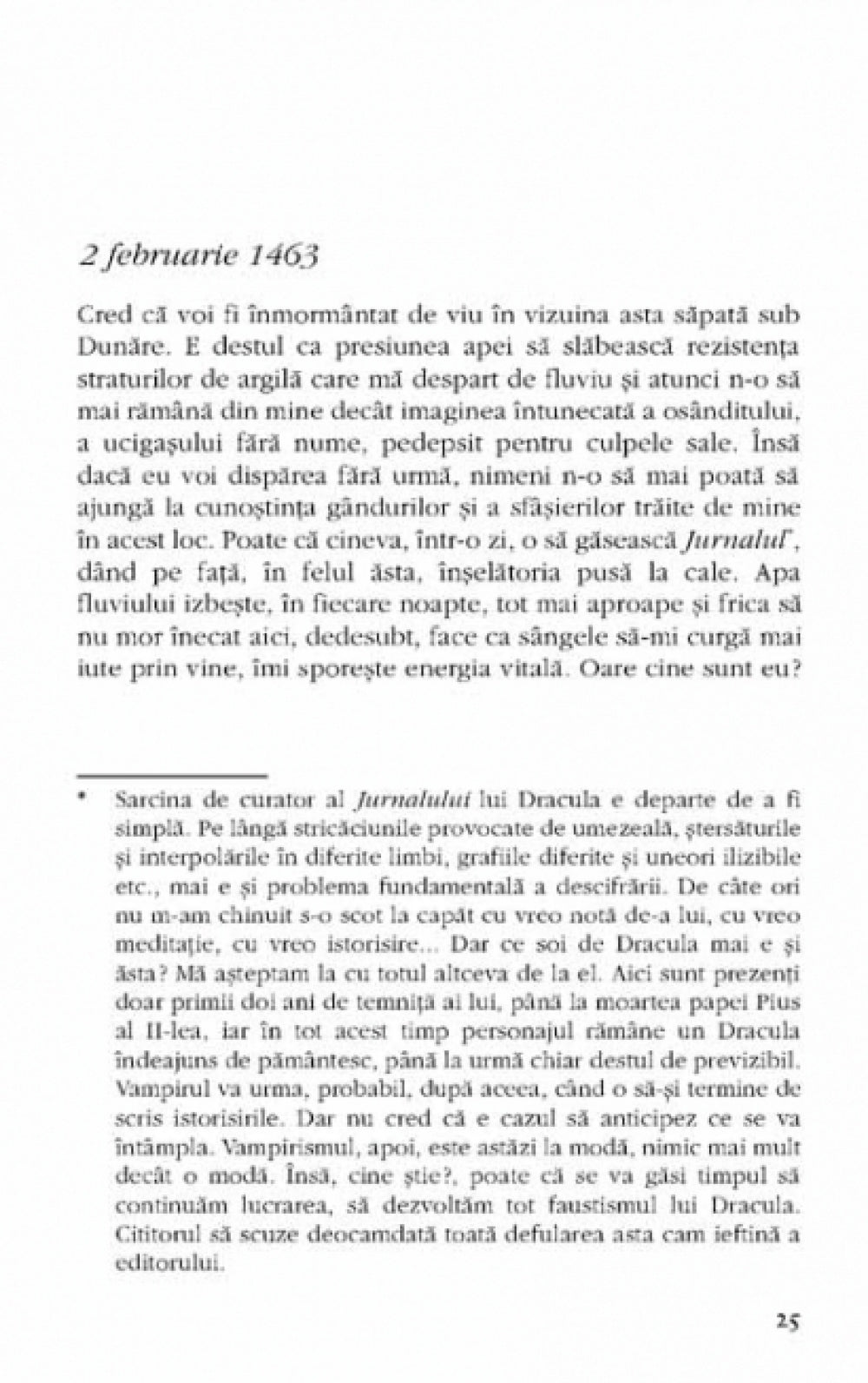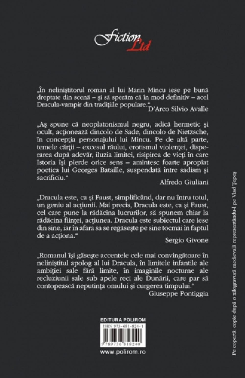 Romanul istoric al lui Marin Mincu il are ca protagonist si totodata „povestitor” pe Vlad Tepes – scriitorul adopta formula jurnalului regasit, pentru a-l putea prezenta pe „Dracula” altfel decit mizind pe legendara sa cruzime sau pe mult vehiculatele povestiri cu vampiri. Dimpotriva, Mincu reinvie personajul istoric, un loc de prim-plan in naratiune ocupindu-l intrigile politice carora domnitorul le-a fost in parte victima, dar fiind prezentate totodata, in descrierea „subiectiva” a naratorului Tepes, si lupta sa permanenta pentru tron cu rivalii, razboaiele impotriva turcilor, precum si anii in care el este inchis de catre Matei Corvin in temnita castelului de la Visegrad. Publicat in Italia in 1992, romanul s-a bucurat de succes, fiind remarcat in presa din aceasta tara ca o repunere in drepturi a unui „intelectual umanist din secolul al XV-lea” si, totodata, ca o satirizare din perspectiva culturala a legendelor cu vampiri ce au denaturat figura unei personalitati care ar fi meritat un alt destin istoric. In Romania, romanul nu a mai fost publicat.