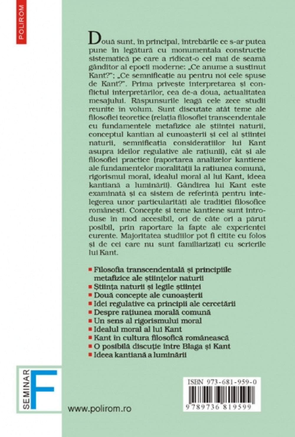 Cele zece studii reunite in acest volum readuc in discutie atit teme ale filosofiei teoretice kantiene (relatia filosofiei transcendentale cu fundamentele metafizice ale stiintei naturii, conceptul kantian al cunoasterii si cel al stiintei naturii, semnificatia consideratiilor lui Kant asupra ideilor regulative ale ratiunii), cit si teme ale filosofiei practice (raportarea analizelor kantiene ale fundamentelor moralitatii la ratiunea comuna, rigorismul moral, idealul moral al lui Kant, ideea kantiana a luminarii). Gindirea lui Kant este examinata si ca sistem de referinta pentru intelegerea unor particularitati ale traditiei filosofice romanesti. Concepte si teme kantiene sint introduse in mod accesibil, ori de cite ori a parut posibil prin raportare la fapte ale experientei curente. Majoritatea studiilor pot fi citite cu folos si de cei care nu sint familiarizati cu scrierile lui Kant.