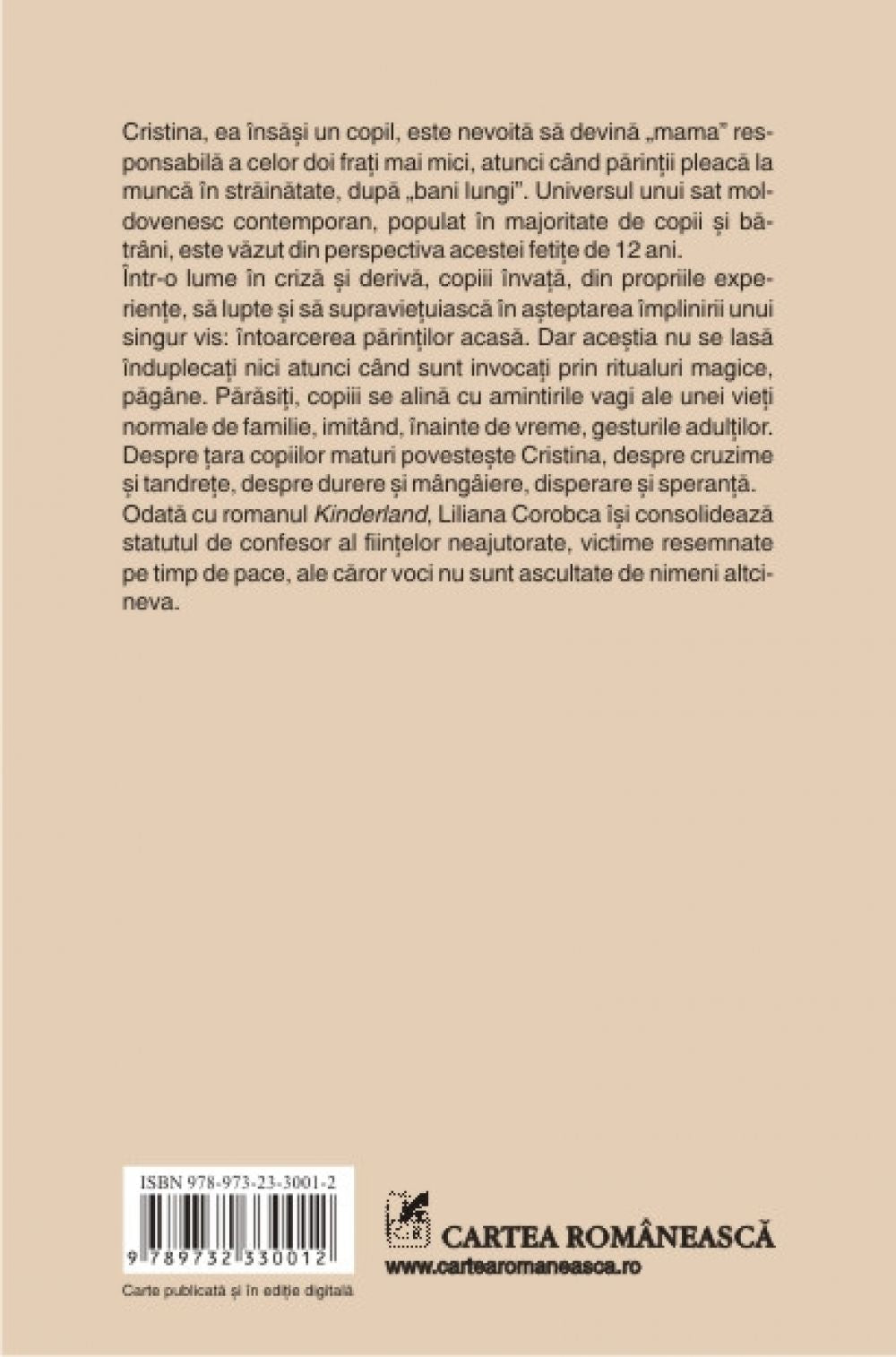 Odata cu romanul Kinderland, Liliana Corobca isi consolideaza statutul de confesor al fiintelor neajutorate, victime resemnate pe timp de pace, ale caror voci nu sint ascultate de nimeni altcineva.