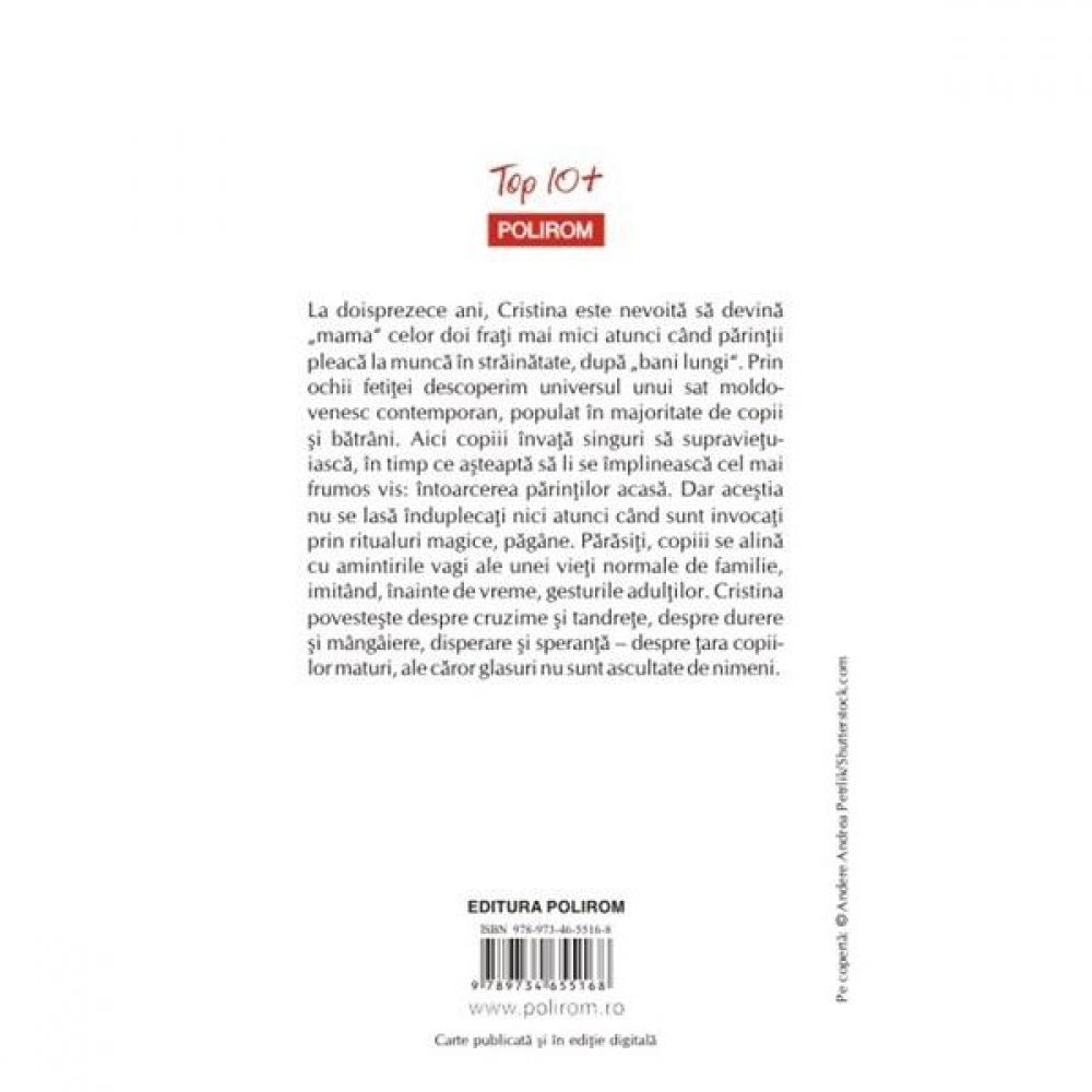 La doisprezece ani, Cristina este nevoita sa devina „mama” celor doi frati mai mici atunci cind parintii pleaca la munca in strainatate, dupa „bani lungi”. Prin ochii fetitei descoperim universul unui sat moldovenesc contemporan, populat in majoritate de copii si batrini. Aici copiii invata singuri sa supravietuiasca, in timp ce asteapta sa li se implineasca cel mai frumos vis: intoarcerea parintilor acasa. Dar acestia nu se lasa induplecati nici atunci cind sint invocati prin ritualuri magice, pagine. Parasiti, copiii se alina cu amintirile vagi ale unei vieti normale de familie, imitind, inainte de vreme, gesturile adultilor. Cristina povesteste despre cruzime si tandrete, despre durere si mingiiere, disperare si speranta – despre tara copiilor maturi, ale caror glasuri nu sint ascultate de nimeni.