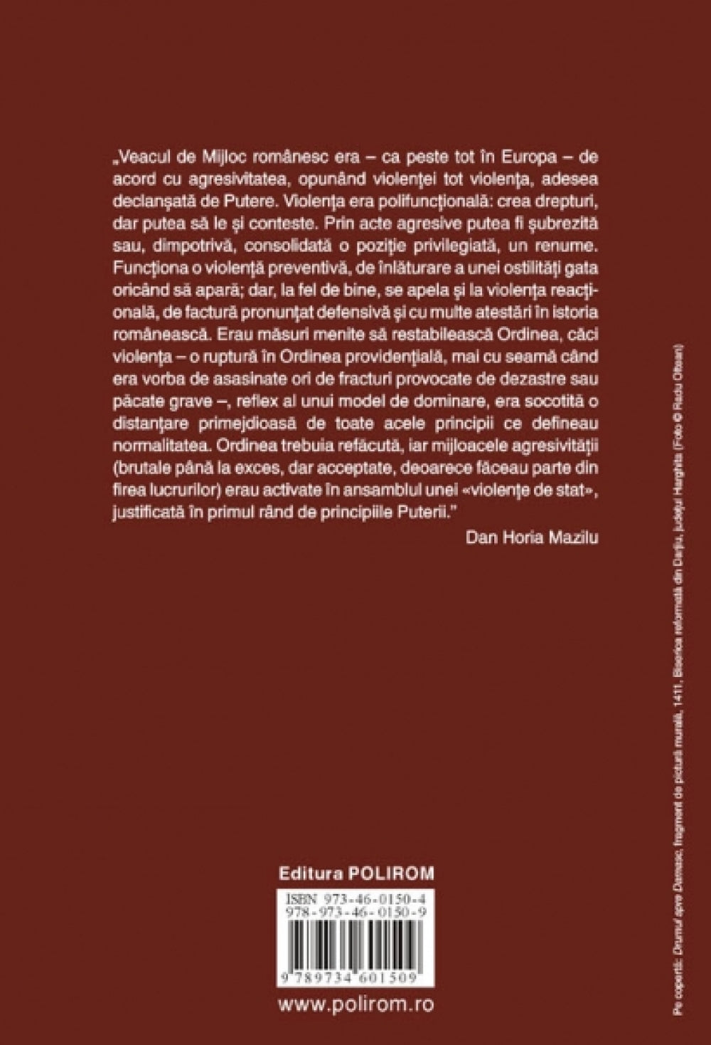Istoric al literaturii romane vechi, profesorul Dan Horia Mazilu dezvaluie in acest volum, cercetind minutios cronici muntene sau moldovene, o lume medievala romaneasca incarcata in toate straturile ei de violenta. Din relatarile cronicarilor se contureaza o „paradigma insingerata” ce insoteste primele timpuri de istorie statala a Tarii Romanesti si Moldovei, caci puterea se cistiga si era pastrata prin mijloace deloc pasnice si se pierdea adesea prin suprimarea detinatorului ei. Dar tensiunea si relatiile conflictuale caracterizeaza in egala masura centrul, ca si periferia, violenta este atit a voievozilor, cit si a marginalilor. Hoti, tilhari, falsificatori, desfrinati si prostituate, ucigasi alcatuiesc o lume pestrita, mintuita citeodata prin imaginarul popular al haiduciei, insa traind prin violenta si ale carei cruzimi erau reprimate prin pedepse nu mai putin crude. Daca, asa cum s-a spus, violenta face incontestabil parte din definitia Evului Mediu european, cartea lui Dan Horia Mazilu confirma din plin ca nici cel romanesc nu face exceptie.