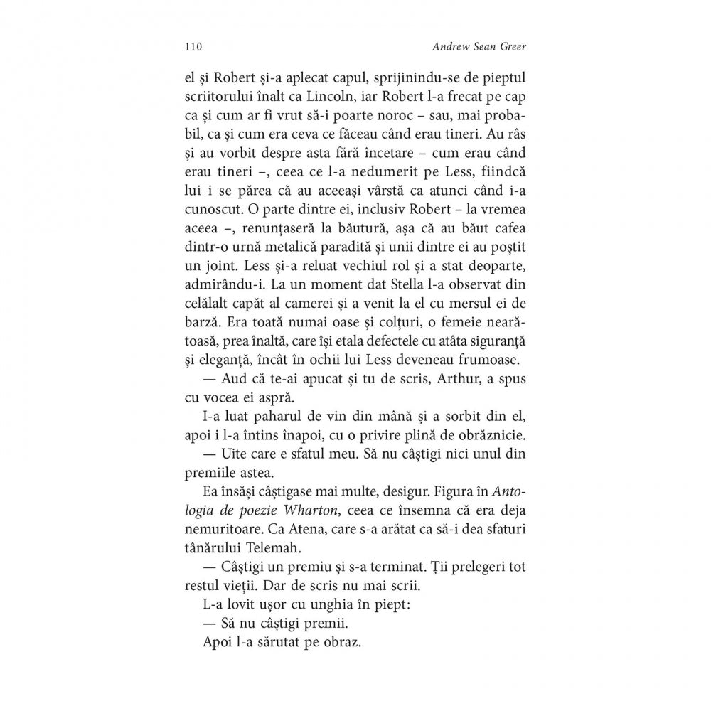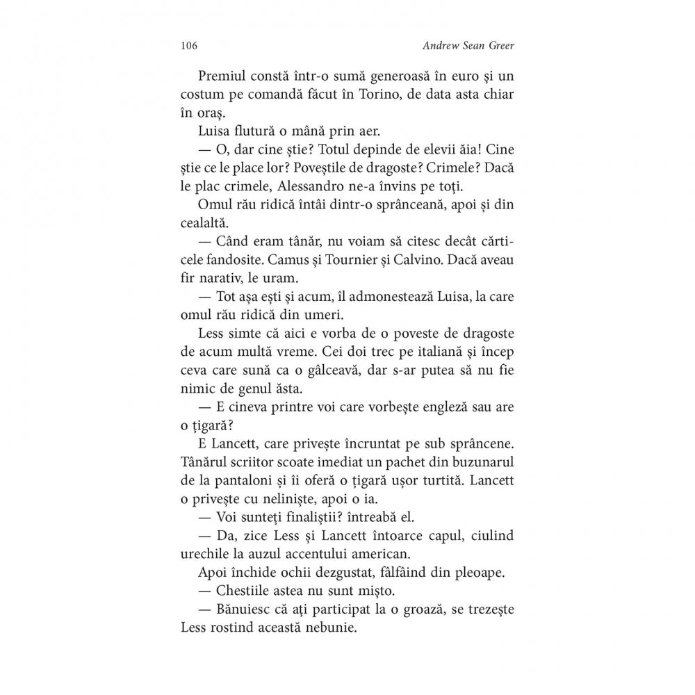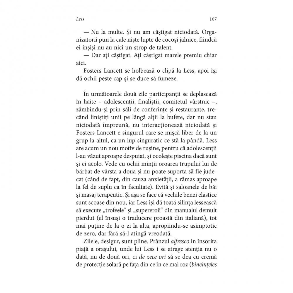 Premiul Pulitzer 2018Less este povestea calatoriei lui Arthur prin lume si prin propriul trecut. Romancier esuat, el e pe cale sa implineasca cincizeci de ani. Intr-o zi primeste prin posta o invitatie la nunta: astfel incepe fantezia lui in jurul lumii in optzeci de zile, care il va duce in Mexic, Italia, Germania, Maroc, India si Japonia si va lasa mii de kilometri intre el si problemele cu care refuza sa se confrunte. Ce ar putea merge prost? Ei bine, Arthur se indragosteste in Franta, scapa de moarte ca prin urechile acului la Berlin, supravietuieste cu greu unei furtuni de nisip in Sahara si ajunge in Japonia prea devreme pentru florile de cires. O poveste de dragoste, uneori cu un ghimpe impotriva „americanului in strainatate”, dar si o meditatie inspirata de trecerea timpului si de simtaminte umane, Less dezvaluie un scriitor cu talentul rar de a inlatura valul care ascunde comedia umana.„Greer face din calatoria picaresca a lui Arthur Less un roman intelept, spiritual. Nu e o poveste turistica precum Maninca, roaga-te, iubeste, ci mai degraba un jurnal de calatorie plin de umilinte ce se termina fericit, cu un personaj care ajunge sa se cunoasca pe sine.” (The National Book Review)„Desi Greer este inzestrat cu talentul de a surprinde situatiile amuzante, el mediteaza si la lucruri profunde. Protagonistul se lasa furat de gindul inaintarii in virsta, al singuratatii, se teme ca-i parasit de talent, isi plinge uneori de mila. Toate acestea fac din Arthur personajul unui roman puternic, amuzant si intelept, plin de intorsaturi de situatie neasteptate.” (San Francisco Chronicle)„Precum Arthur, protagonistul povestii, Less este un companion excelent... E cel mai amuzant, mai inteligent, mai uman roman aparut de la debutul lui Tom Rachman, in 2010, cu The Imperfectionists.” (The New York Times Book Review)