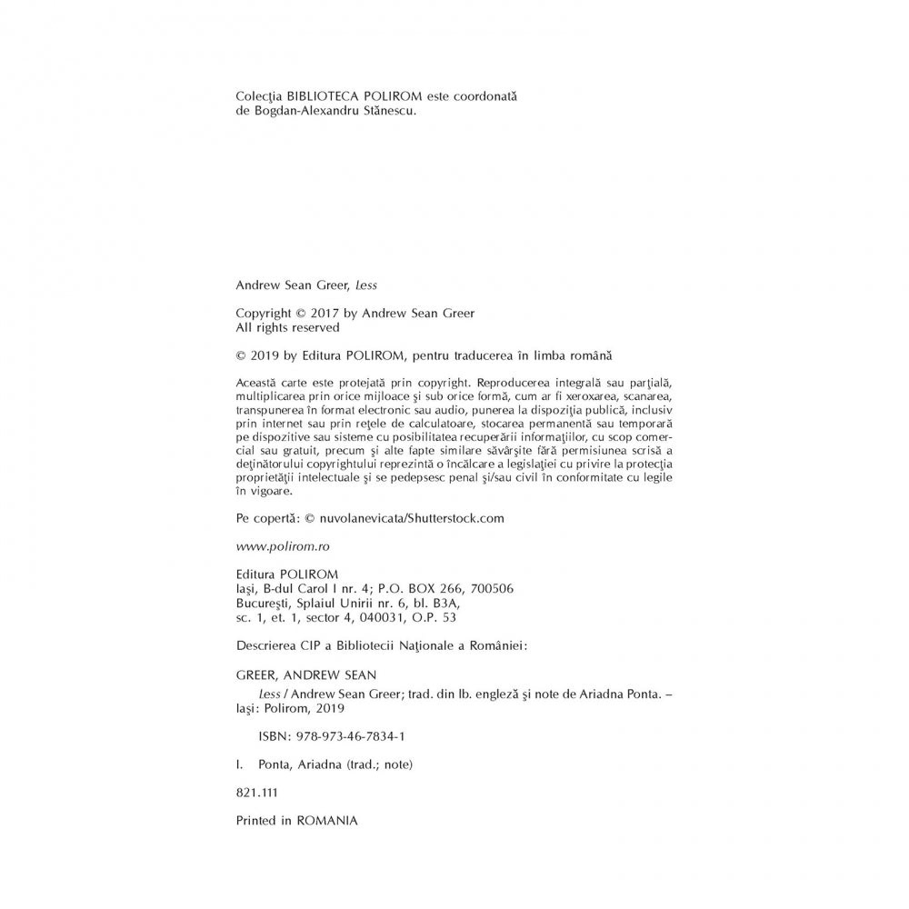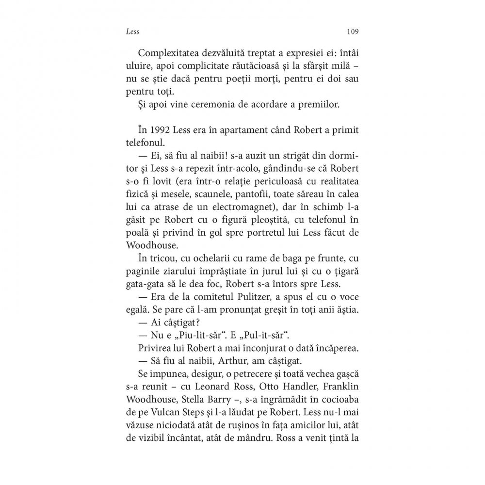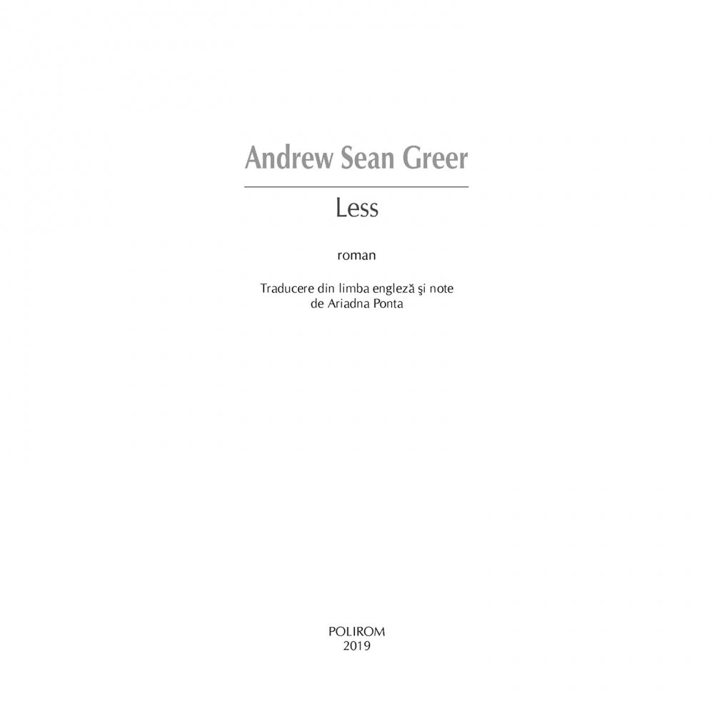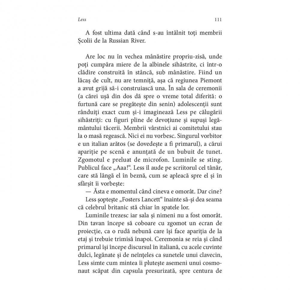 Premiul Pulitzer 2018Less este povestea calatoriei lui Arthur prin lume si prin propriul trecut. Romancier esuat, el e pe cale sa implineasca cincizeci de ani. Intr-o zi primeste prin posta o invitatie la nunta: astfel incepe fantezia lui in jurul lumii in optzeci de zile, care il va duce in Mexic, Italia, Germania, Maroc, India si Japonia si va lasa mii de kilometri intre el si problemele cu care refuza sa se confrunte. Ce ar putea merge prost? Ei bine, Arthur se indragosteste in Franta, scapa de moarte ca prin urechile acului la Berlin, supravietuieste cu greu unei furtuni de nisip in Sahara si ajunge in Japonia prea devreme pentru florile de cires. O poveste de dragoste, uneori cu un ghimpe impotriva „americanului in strainatate”, dar si o meditatie inspirata de trecerea timpului si de simtaminte umane, Less dezvaluie un scriitor cu talentul rar de a inlatura valul care ascunde comedia umana.„Greer face din calatoria picaresca a lui Arthur Less un roman intelept, spiritual. Nu e o poveste turistica precum Maninca, roaga-te, iubeste, ci mai degraba un jurnal de calatorie plin de umilinte ce se termina fericit, cu un personaj care ajunge sa se cunoasca pe sine.” (The National Book Review)„Desi Greer este inzestrat cu talentul de a surprinde situatiile amuzante, el mediteaza si la lucruri profunde. Protagonistul se lasa furat de gindul inaintarii in virsta, al singuratatii, se teme ca-i parasit de talent, isi plinge uneori de mila. Toate acestea fac din Arthur personajul unui roman puternic, amuzant si intelept, plin de intorsaturi de situatie neasteptate.” (San Francisco Chronicle)„Precum Arthur, protagonistul povestii, Less este un companion excelent... E cel mai amuzant, mai inteligent, mai uman roman aparut de la debutul lui Tom Rachman, in 2010, cu The Imperfectionists.” (The New York Times Book Review)