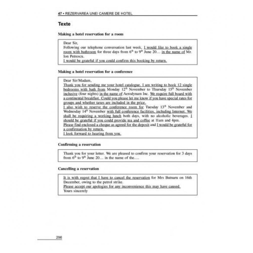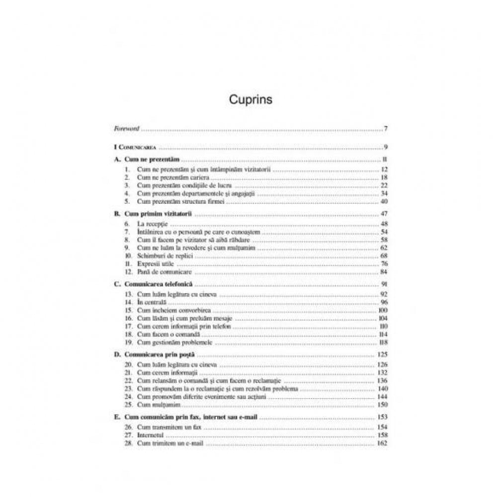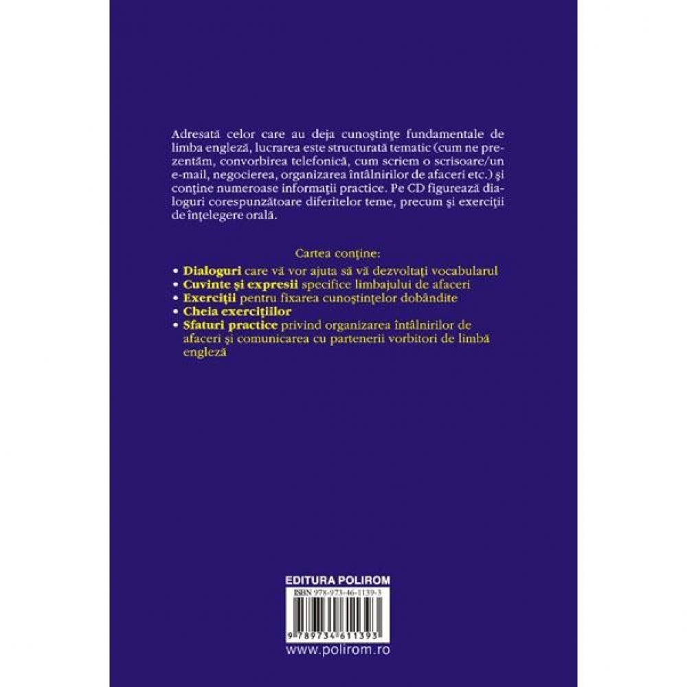 Adresata celor care au deja cunostinte fundamentale de limba engleza, lucrarea este structurata tematic(cum ne prezentam, convorbirea telefonica, cum scriem o scrisoare/un e-mail, negocierea, organizarea intilnirilor de afaceri etc.) si contine numeroase informatii practice.