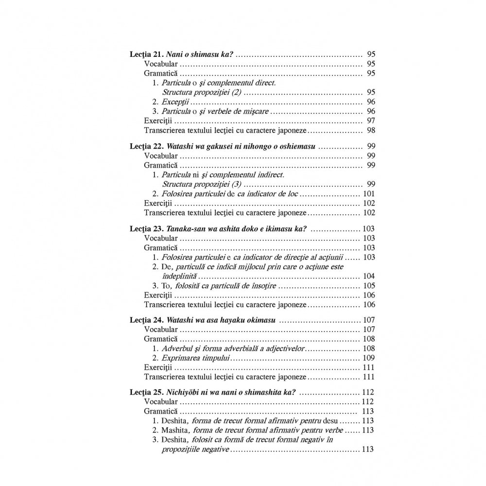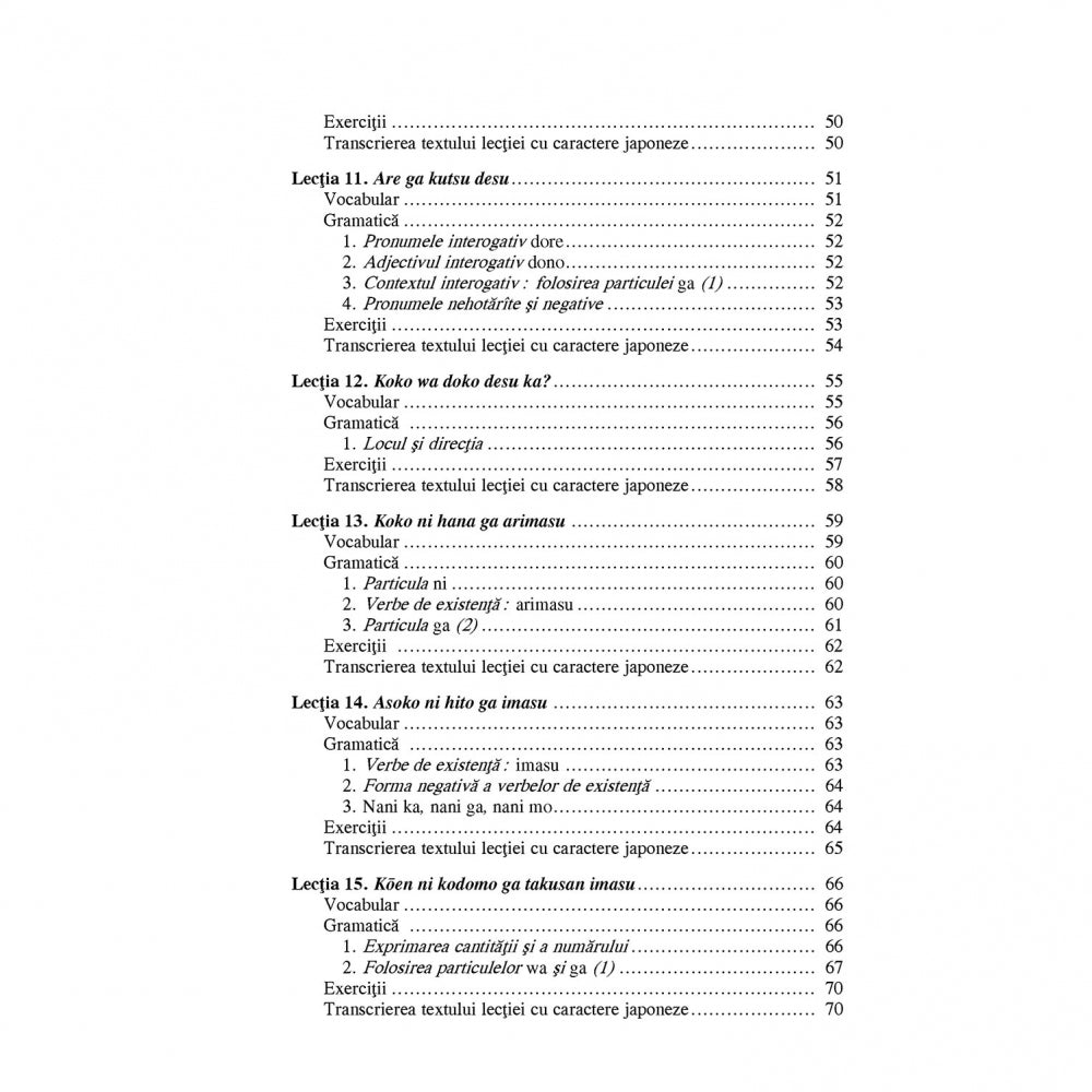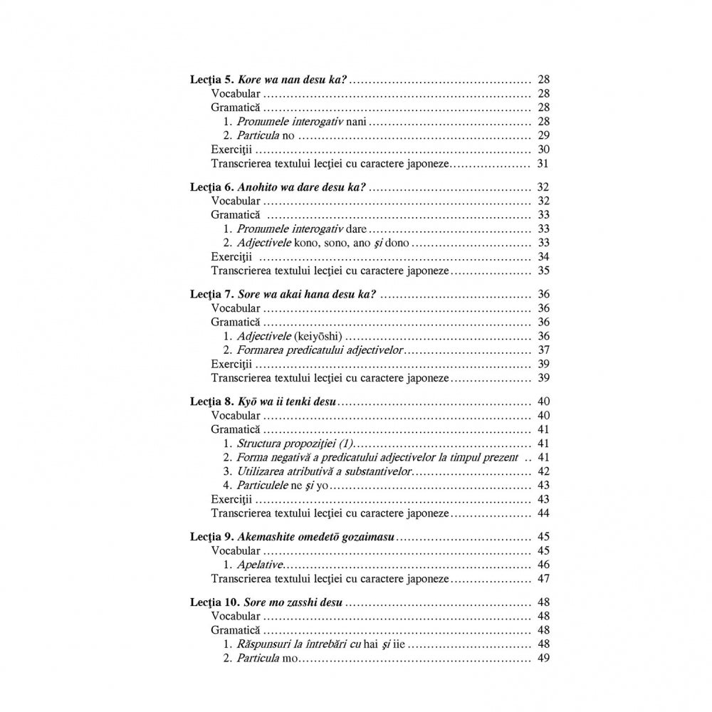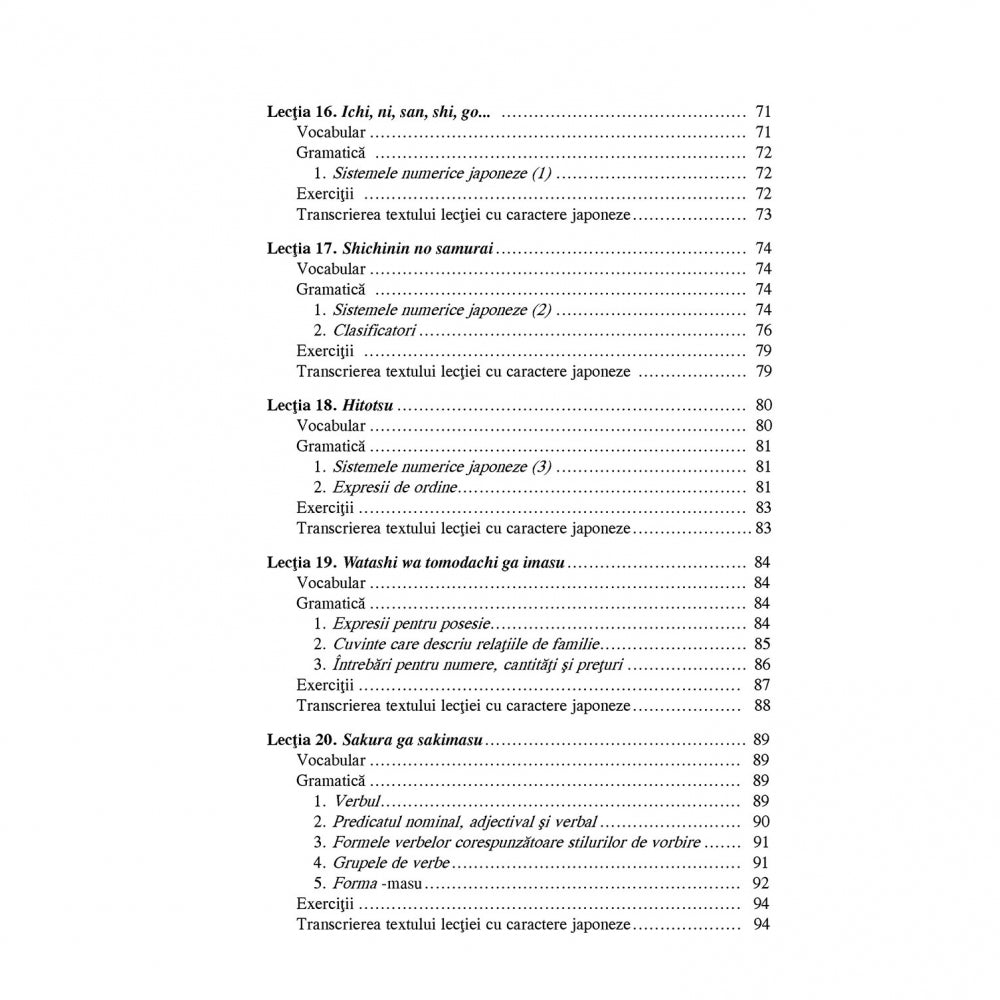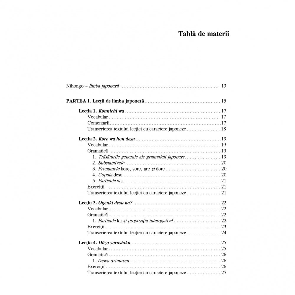 Destinata deopotriva elevilor, studentilor si autodidactilor, Limba japoneza. Simplu si eficient contine elementele fundamentale de pronuntie, vocabular si gramatica. Prima parte a lucrarii, structurata in 31 de lectii, cuprinde notiuni de limba japoneza, in timp ce partea a doua prezinta tipurile de scriere; in completare, cei interesati vor gasi un index de termeni, un index de structuri gramaticale japoneze si anexe cuprinzind setul standard japonez de caractere codate JIS X 0208: 1997, ideogramele folosite in scrierea curenta japoneza si radicalii. Pentru o buna fixare a notiunilor teoretice, fiecare lectie propune exercitii a caror rezolvare poate fi consultata la finalul cartii. Pe CD sint inregistrate textele si vocabularul din cadrul lectiilor, in lectura unor nativi japonezi, in vederea insusirii unei pronuntii corecte.