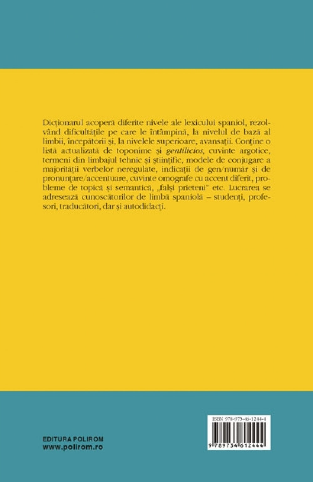 Dictionarul acopera diferite nivele ale lexicului spaniol, rezolvind dificultatile pe care le intimpina, la nivelul de baza al limbii, incepatorii si, la nivelele superioare, avansatii. Contine o lista actualizata de toponime si gentilicios, cuvinte argotice, din limbajul tehnic si stiintific, modele de conjugare a majoritatii verbelor neregulate, indicatii de gen/numar si de pronuntare/accentuare, cuvinte omografe cu accent diferit, probleme de topica si semantica, falsi prieteni etc. Lucrarea se adreseaza cunoscatorilor de limba spaniola – studenti, profesori, traducatori, dar si autodidacti.