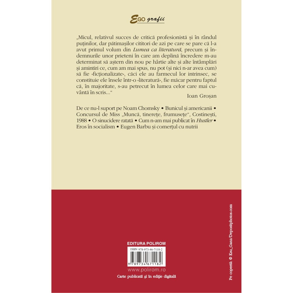 „Micul, relativul succes de critica profesionista si in rindul putinilor, dar patimasilor cititori de azi pe care se pare ca l-a avut primul volum din Lumea ca literatura, precum si indemnurile unor prieteni in care am deplina incredere m-au determinat sa astern din nou pe hirtie alte si alte intimplari si amintiri ce, cum am mai spus, nu pot (si nici n-ar avea cum) sa fie «fictionalizate», caci ele au farmecul lor intrinsec, se constituie ele insele intr-o «literatura», fie macar pentru faptul ca, in majoritate, s-au petrecut in lumea celor care mai cuvinta in scris...” (Ioan Grosan)