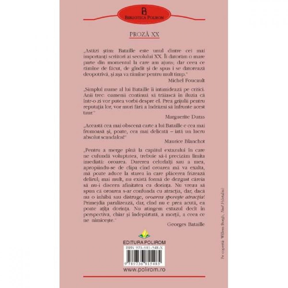 „Simplul nume al lui Bataille ii intimideaza pe critici. Anii trec: oamenii continua sa traiasca in iluzia ca intr-o zi vor putea vorbi despre el. Prea grijulii pentru reputatia lor; vor muri fara a indrazni sa infrunte acest taur.” (Marguerite Duras) „Aceasta cea mai obscena carte a lui Bataille este cea mai frumoasa si, poate, cea mai delicata – iata un lucru absolut scandalos.” (Maurice Blanchot)