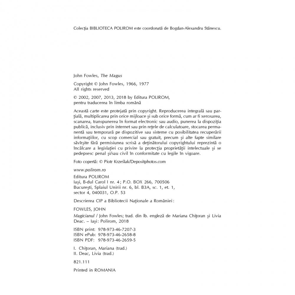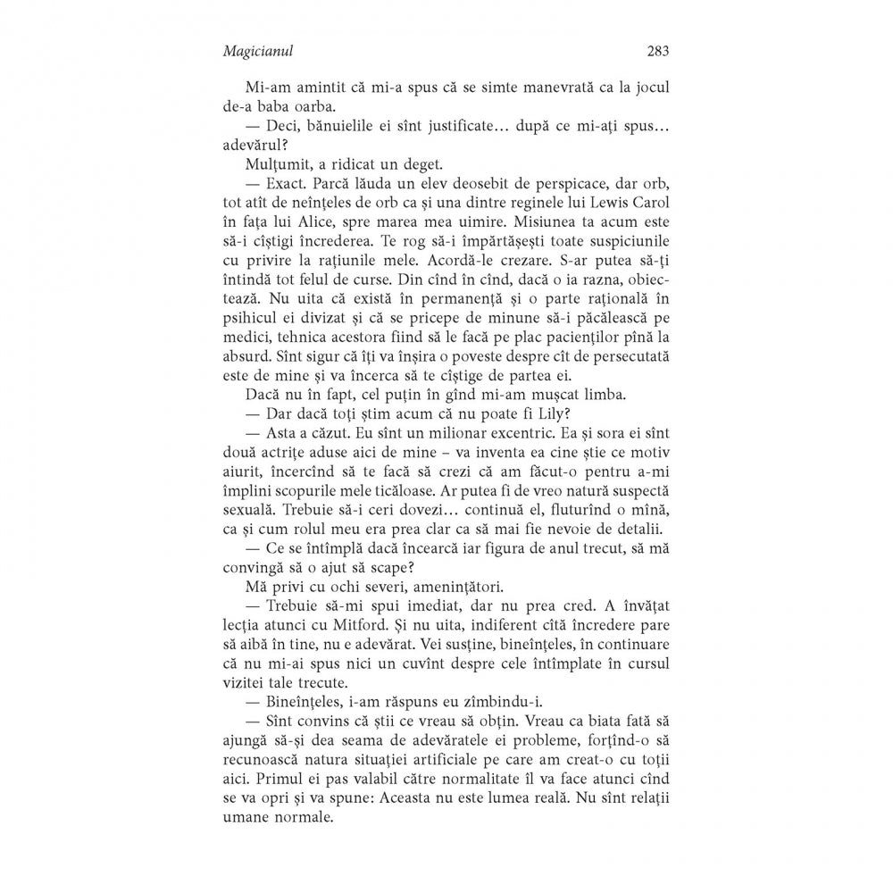 Plasata intr-o insula greceasca, actiunea romanului Magicianul pivoteaza in jurul tinarului profesor de engleza Nicholas Urfe, supus unui lung sir de incercari – prin spectaculoase jocuri cu masti si psihodrame in care abunda fantasmele erotice si manipularea istoriei – de catre „magicianul” Conchis. Unul din marile romane ale secolului XX, Magicianul a fost ecranizat in anul 1968, in regia lui Guy Green, avindu-i in rolurile principale pe Michael Caine, Anthony Quinn si Candice Bergen.
