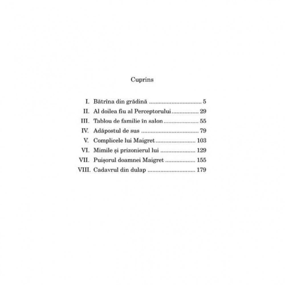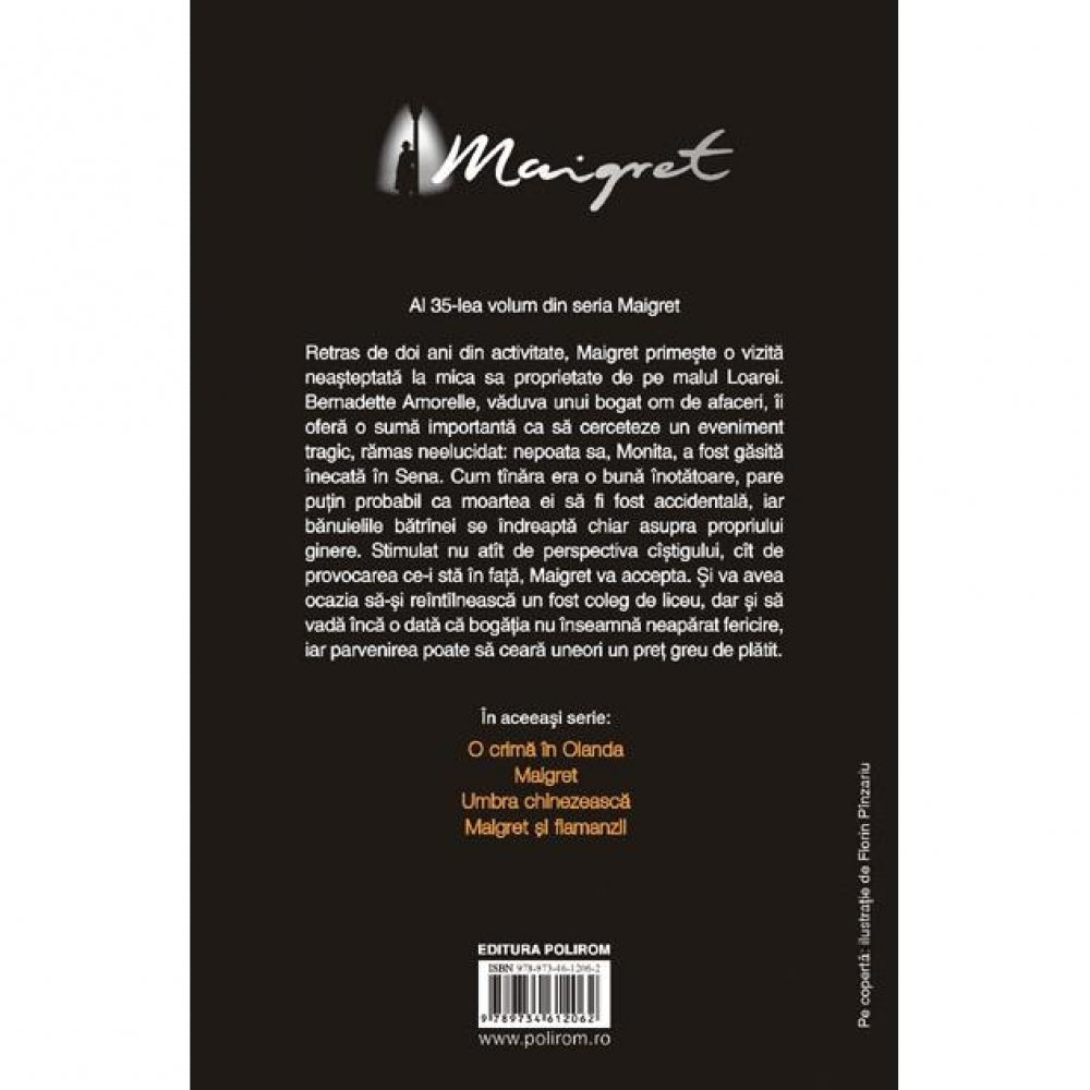 Retras de doi ani din activitate, Maigret primeste o vizita neasteptata la mica sa proprietate de pe malul Loarei. Bernadette Amorelle, vaduva unui bogat om de afaceri, ii ofera o suma importanta ca sa cerceteze un eveniment tragic, ramas neelucidat: nepoata sa, Monita, a fost gasita inecata in Sena. Cum tinara era o buna inotatoare, pare putin probabil ca moartea ei sa fi fost accidentala, iar banuielile batrinei se indreapta chiar spre propriul ginere. Stimulat nu atit de perspectiva cistigului, cit de provocarea ce-i sta in fata, Maigret va accepta. Si va avea ocazia sa-si reintilneasca un fost coleg de liceu, dar si sa vada inca o data ca bogatia nu inseamna neaparat fericire, iar parvenirea poate sa ceara uneori un pret greu de platit.