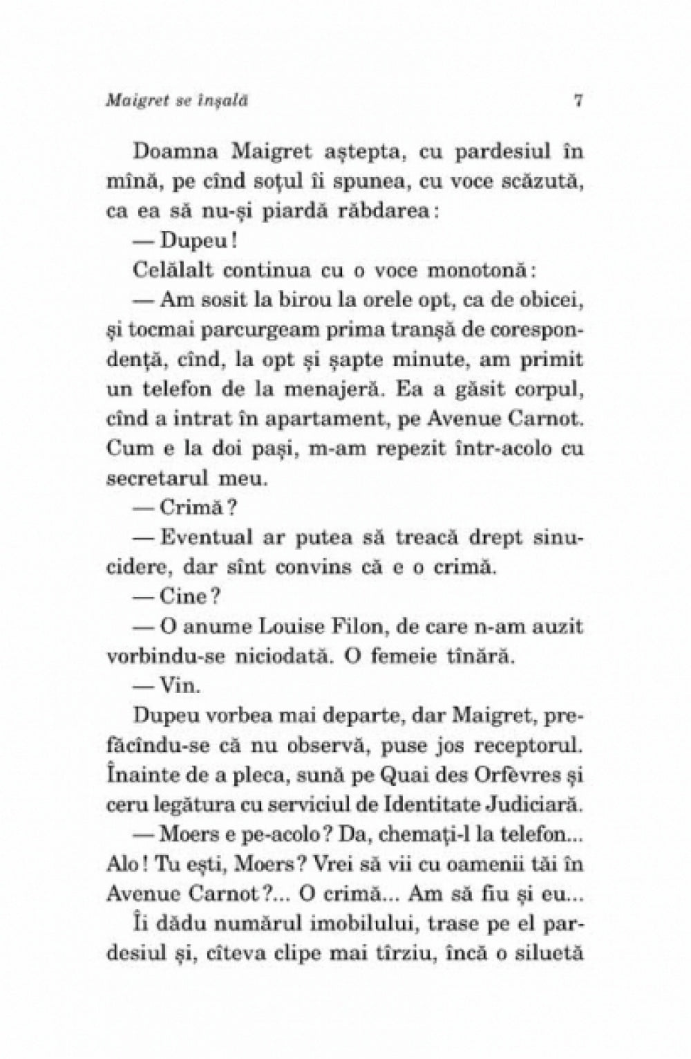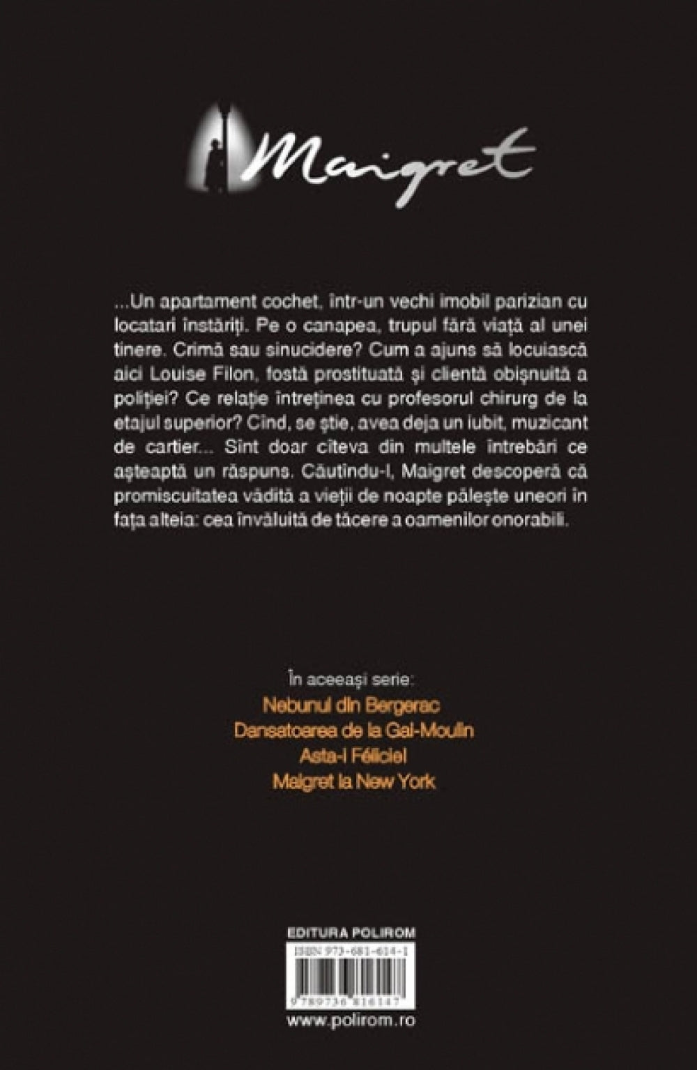 Un apartament cochet, intr-un vechi imobil parizian cu locatari instariti. Pe o canapea, trupul fara viata al unei tinere. Crima sau sinucidere? Cum a ajuns sa locuiasca aici Louise Filon, fosta prostituata si clienta obisnuita a politiei? Si ce relatie intretinea cu profesorul chirurg de la etajul superior? Cind, se stie, avea deja un iubit, muzicant de cartier... Acestea sint doar citeva dintre multele intrebari ce asteapta un raspuns. Cautindu-l, Maigret descopera ca promiscuitatea vadita a vietii de noapte paleste uneori in fata alteia: cea invaluita de tacere a oamenilor onorabili.