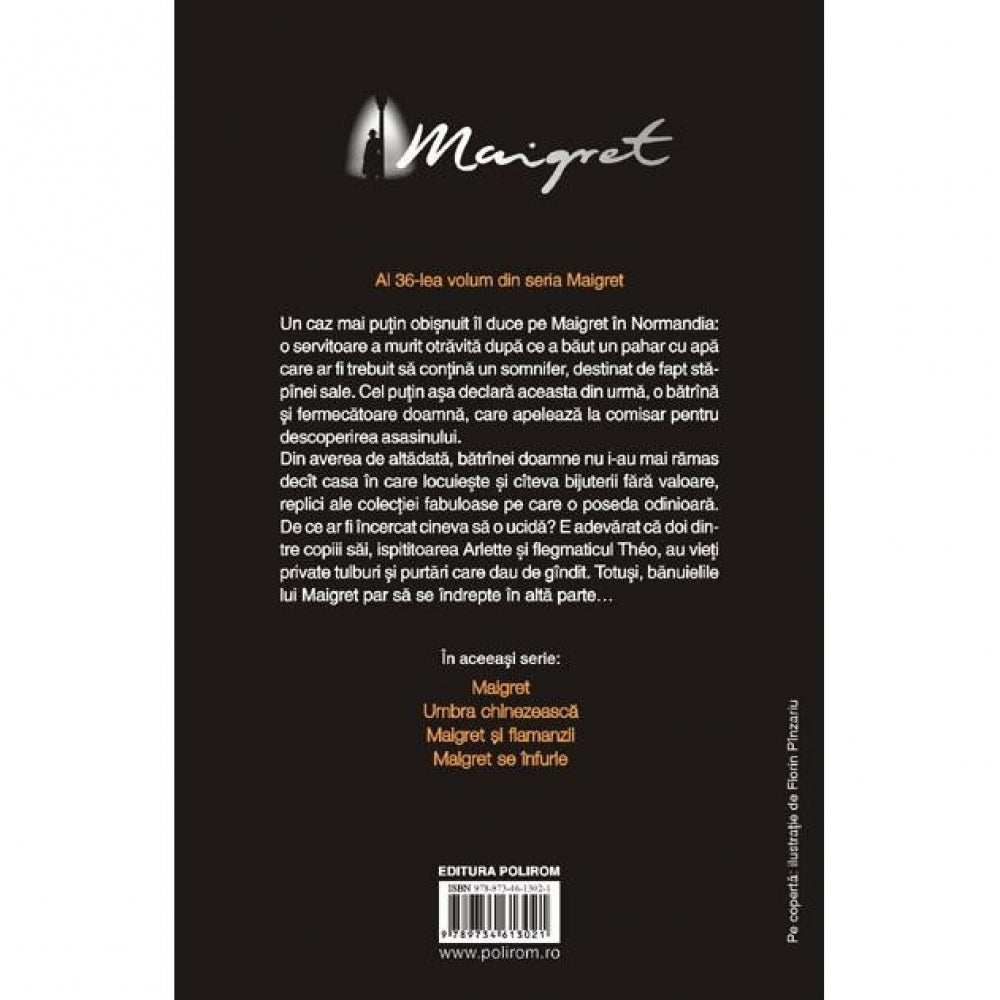 Un caz mai putin obisnuit il duce pe Maigret in Normandia: o servitoare a murit otravita dupa ce a baut un pahar cu apa care ar fi trebuit sa contina un somnifer, destinat de fapt stapinei sale. Cel putin asa declara aceasta din urma, o batrina si fermecatoare doamna, care apeleaza la comisar pentru descoperirea asasinului.