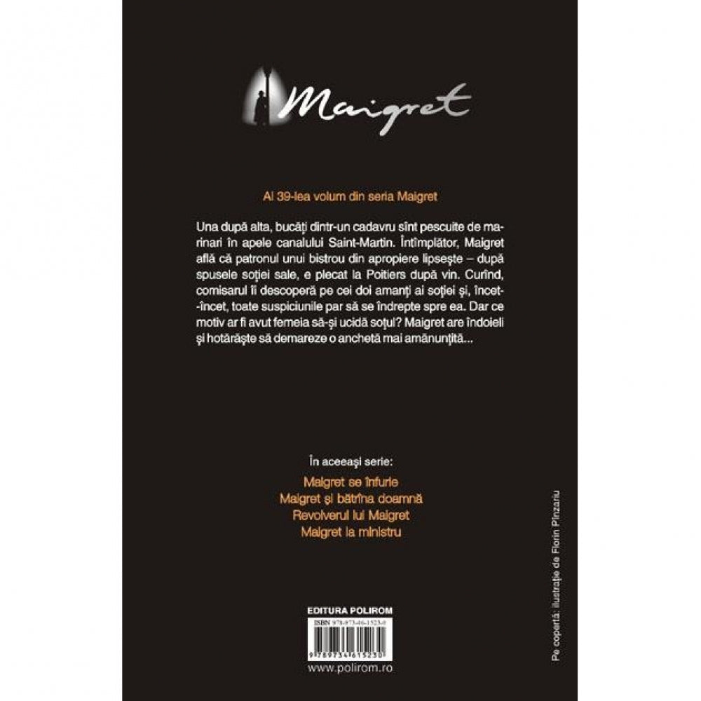 Una dupa alta, bucati dintr-un cadavru sint pescuite de marinari in apele canalului Saint-Martin. Intimplator, Maigret afla ca patronul unui bistrou din apropiere lipseste – dupa spusele sotiei sale, e plecat la Poitiers dupa vin. Curind, comisarul ii descopera pe cei doi amanti ai sotiei si, incet-incet, toate suspiciunile par sa se indrepte spre ea. Dar ce motiv ar fi avut femeia sa-si ucida sotul? Maigret are indoieli si hotaraste sa demareze o ancheta mai amanuntita...