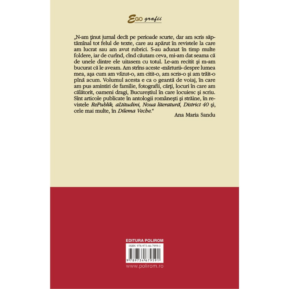 „N-am tinut jurnal decat pe perioade scurte, dar am scris saptamanal tot felul de texte, care au aparut in revistele la care am lucrat sau am avut rubrici. S-au adunat in timp multe foldere, iar de curand, cand cautam ceva, mi-am dat seama ca de unele dintre ele uitasem cu totul. Le-am recitit si m-am bucurat ca le aveam. Am strans aceste «marturii» despre lumea mea, asa cum am vazut-o, am citit-o, am scris-o si am trait-o pina acum. Volumul acesta e ca o geanta de voiaj, in care am pus amintiri de familie, fotografii, carti, locuri in care am calatorit, oameni dragi, Bucurestiul in care locuiesc si scriu. Sunt articole publicate in antologii romanesti si straine, in revistele RePublik, Altitudini, Noua literatura, District 40 si, cele mai multe, in Dilema Veche.” (Ana Maria Sandu)